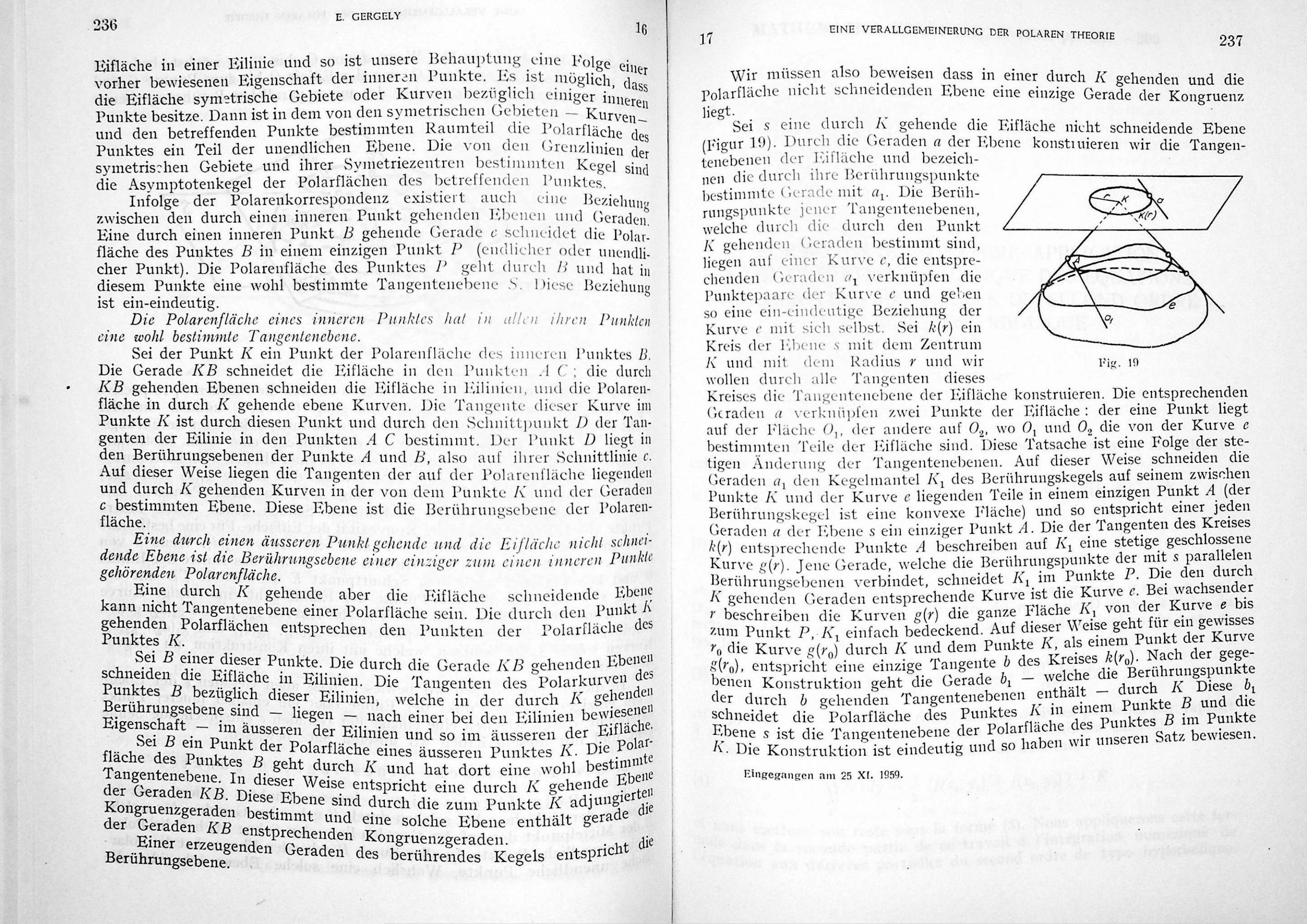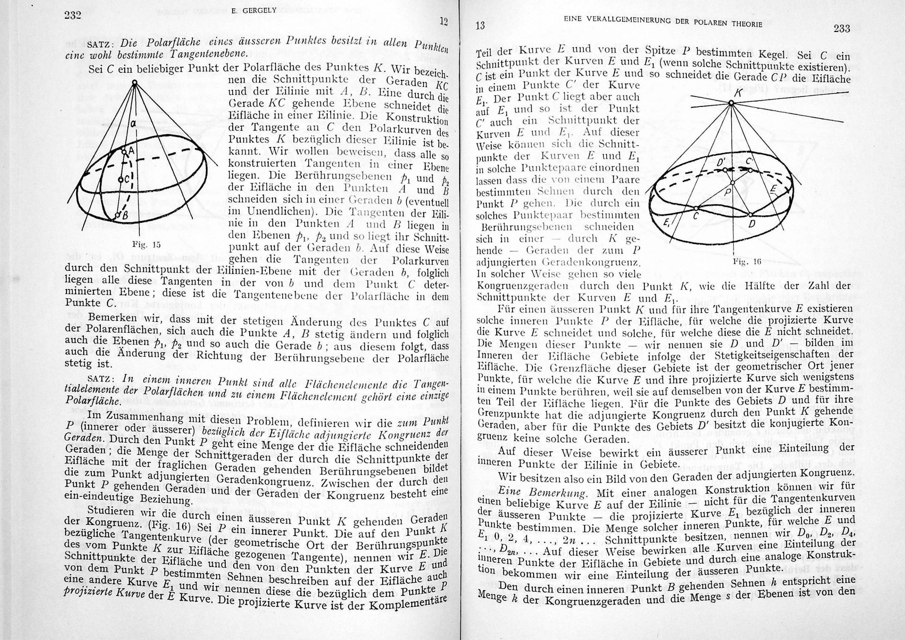 want to construct the tangent plane of the egg surface using all tangents to this circle. The corresponding lines a connect two points on the egg surface: one point lies on the surfaceO_(1), the other one onO_(2), whereO_(1)andO_(2)the one from the curveecertain parts of the egg surface. This fact is a consequence of the continuous change of the tangent planes. In this way, the lines intersect.a_(1)the cone shellK_(1)of the cone of contact on its between pointsKand the curveeLying parts at a single pointA(the cone of tangency is a convex surface) and thus each line a of the plane s corresponds to a single point.AThe tangents of the circlek(r)corresponding pointsAdescribe onK_(1)a continuous closed curveg(r). That straight line which defines the points of tangency of the withsconnects parallel contact planes, intersectsK_(1)at the pointP. The throughKThe curve corresponding to the straight line is the curvee. Asrincreases, the curves describeg(r)the entire areaK_(1)of the curveeto the pointP,K_(1)simply covering. In this way, for a certainr_(0)the curveg(r_(0))throughKand the pointK, as a point on the curveg(r_(0)), corresponds to a single tangentbof the circlek(r_(0)). According to the given construction, the lineb_(1)- which are the points of contact of thebincludes tangent planes - throughKThisb_(1)intersects the polar surface of the pointKin one pointBand the planesis the tangent plane of the polar surface of the pointBat the pointKThe construction is unambiguous, and thus we have proven our theorem.