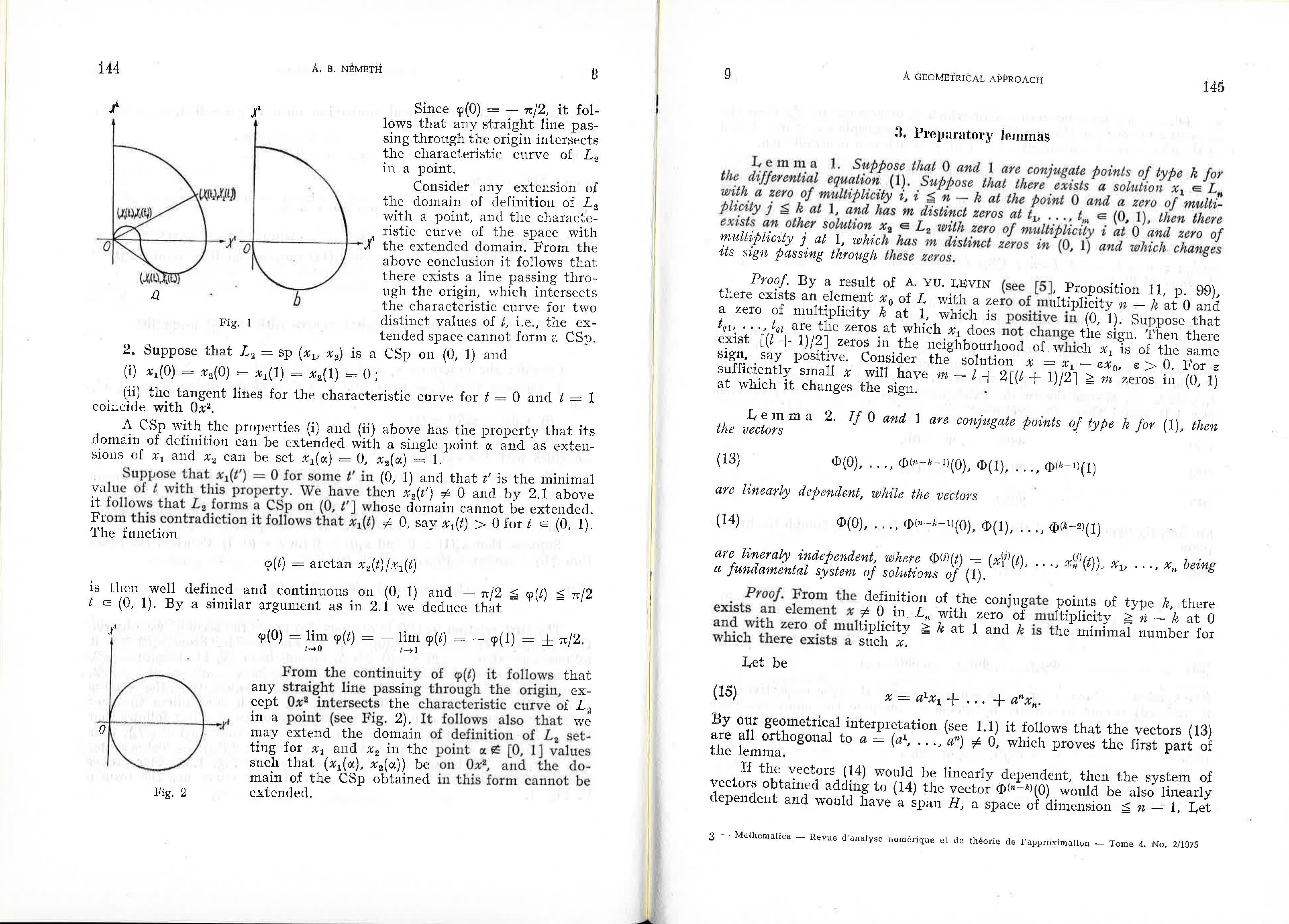 If the vectors (14) would be linearly dependent, then the system of vectors obtained adding to (14) the vector Phi^((n-k))(0)\Phi^{(n-k)}(0) would be also linearly dependent and would have a span HH, a space of dimension <= n-1\leqq n-1. Let a=(a^(1),dots,a^(n))a=\left(a^{1}, \ldots, a^{n}\right) be a nonzero vector which is orthogonal to HH. Then the element xx of the form (15) would have a zero of multiplicity >= n-k+1\geqq n-k+1 at 0 and a zero of multiplicity k-1k-1 at 1 , which is a contradiction. L,emm\mathrm{L}, \mathrm{e} \mathrm{m} \mathrm{m} a 3. Suppose that 0 and 1 are conjugate points of type kk for the differential equation (1). Then the set of functions xx in L_(n)L_{n}, the space of solutions of (1), with the property that