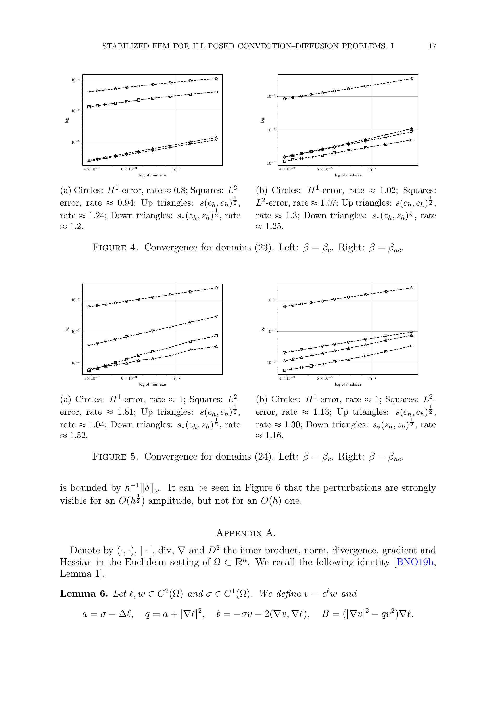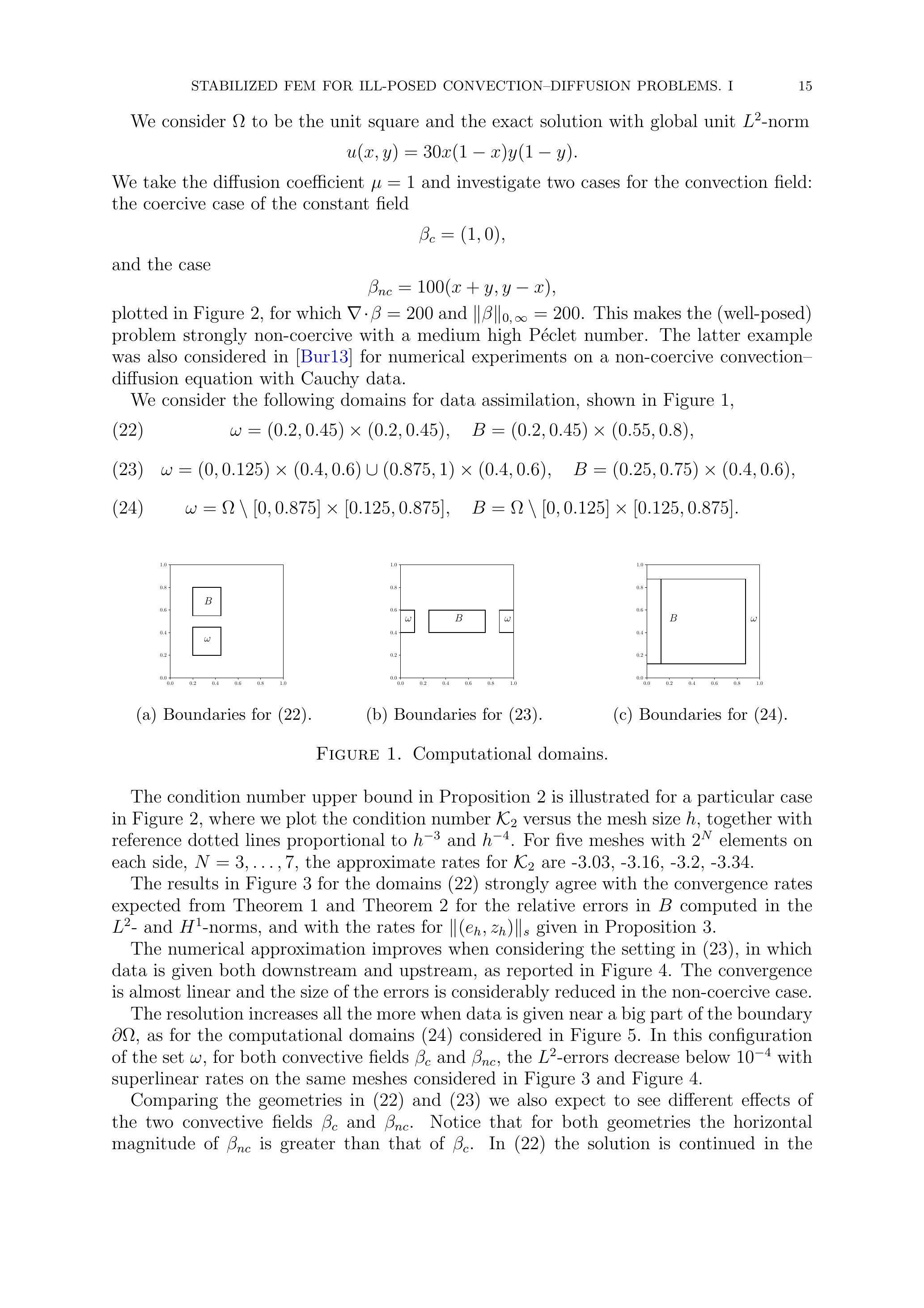 The resolution increases all the more when data is given near a big part of the boundary \(\partial \Omega\), as for the computational domains (24) considered in Figure 5. In this configuration of the set \(\omega\), for both convective fields \(\beta_{c}\) and \(\beta_{n c}\), the \(L^{2}\)-errors decrease below \(10^{-4}\) with superlinear rates on the same meshes considered in Figure 3 and Figure 4.