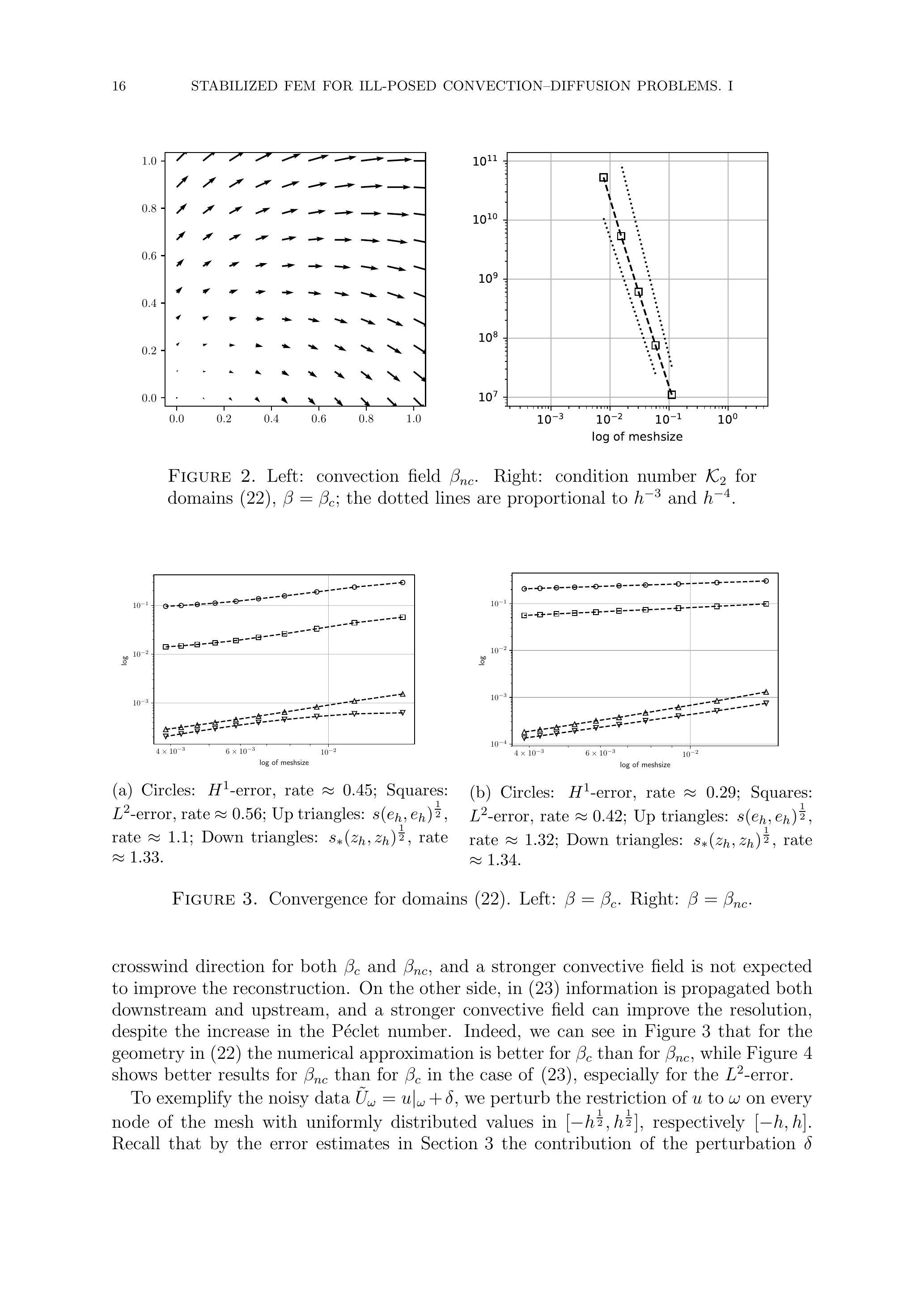 crosswind direction for both \(\beta_{c}\) and \(\beta_{n c}\), and a stronger convective field is not expected to improve the reconstruction. On the other side, in (23) information is propagated both downstream and upstream, and a stronger convective field can improve the resolution, despite the increase in the Péclet number. Indeed, we can see in Figure 3 that for the geometry in (22) the numerical approximation is better for \(\beta_{c}\) than for \(\beta_{n c}\), while Figure 4 shows better results for \(\beta_{n c}\) than for \(\beta_{c}\) in the case of (23), especially for the \(L^{2}\)-error.