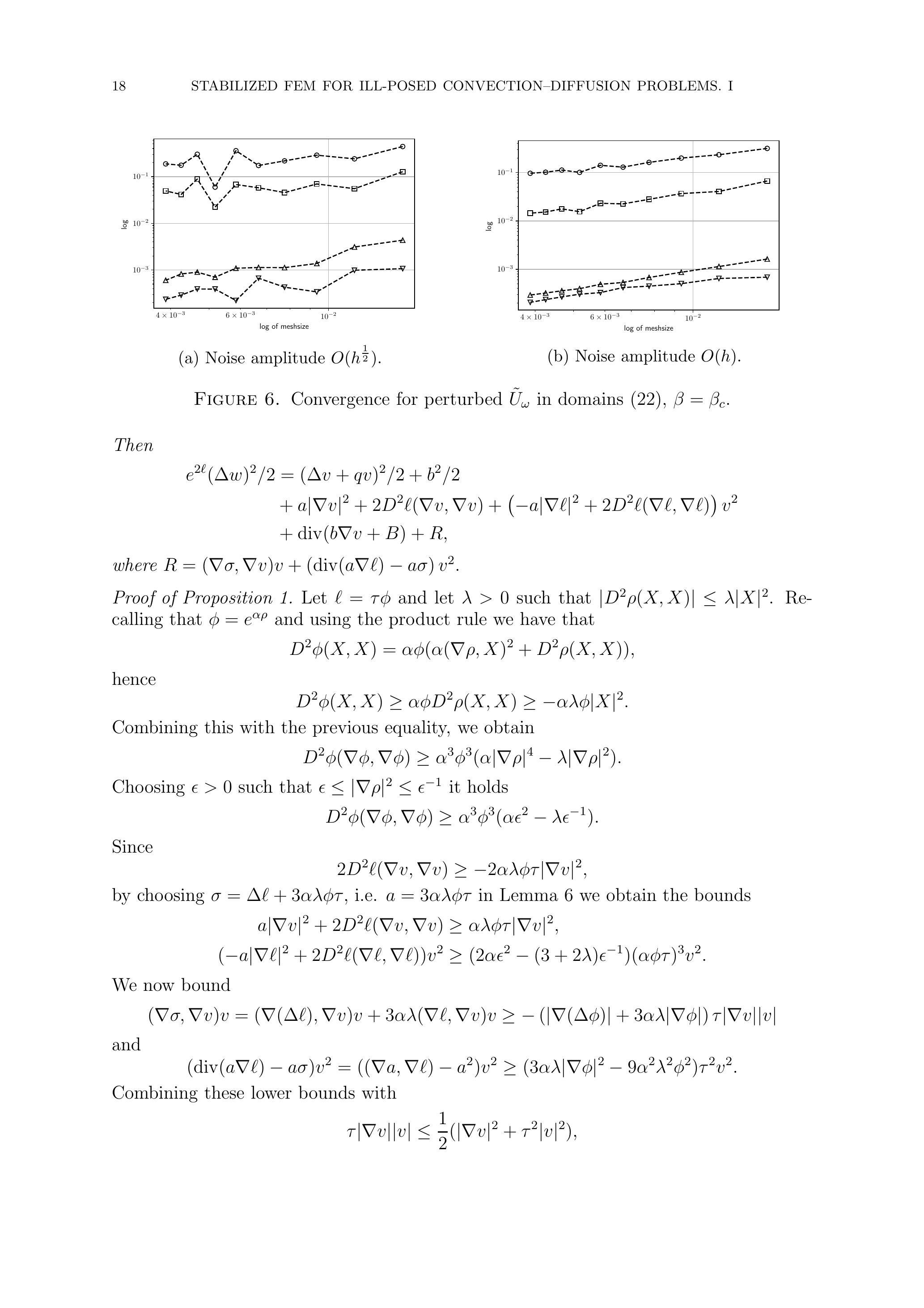 where \(\Omega \subset \mathbb{R}^{n}\) is open, bounded and connected, \(\mu>0\) is the diffusion coefficient and \(\beta \in \left[W^{1, \infty}(\Omega)\right]^{n}\) is the convective velocity field. We assume that no information is given on the boundary \(\partial \Omega\) and that there exists a solution \(u \in H^{2}(\Omega)\) satisfying (1). For an open and connected subset \(\omega \subset \Omega\), define the perturbed restriction \(\tilde{U}_{\omega}:=\left.u\right|_{\omega}+\delta\), where \(\delta \in L^{2}(\omega)\) is an unknown function modelling measurement noise. The data assimilation (or unique continuation) problem consists in finding \(u\) given \(f\) and \(\tilde{U}_{\omega}\). Here the coefficients \(\mu\) and \(\beta\), and the source term \(f\) are assumed to be known. This linear problem is ill-posed and it is closely related to the elliptic Cauchy problem, see e.g. [ARRV09]. Potential applications include for example flow problems for which full boundary data are not accessible, but where local measurements (in a subset of the domain or on a part of the boundary) can be obtained.