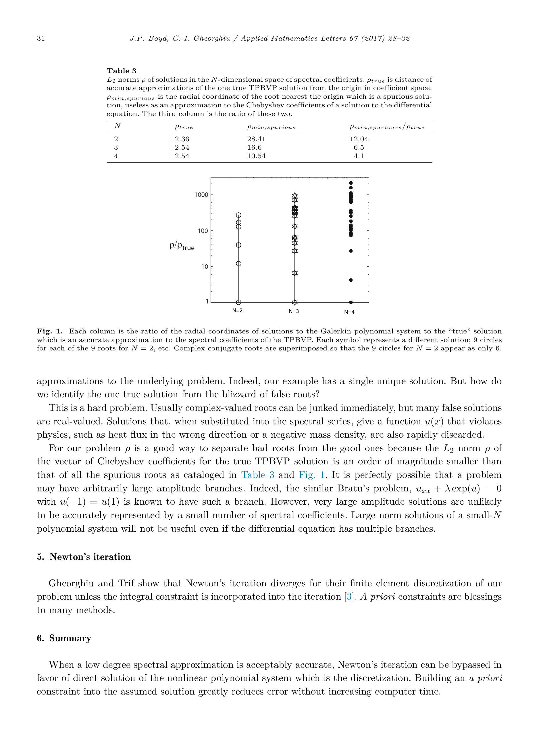 Table 3 L_(2)L_{2} norms rho\rho of solutions in the NN-dimensional space of spectral coefficients. rho_("true ")\rho_{\text {true }} is distance of accurate approximations of the one true TPBVP solution from the origin in coefficient space. rho_("min "," spurious ")\rho_{\text {min }, \text { spurious }} is the radial coordinate of the root nearest the origin which is a spurious solution, useless as an approximation to the Chebyshev coefficients of a solution to the differential equation. The third column is the ratio of these two.