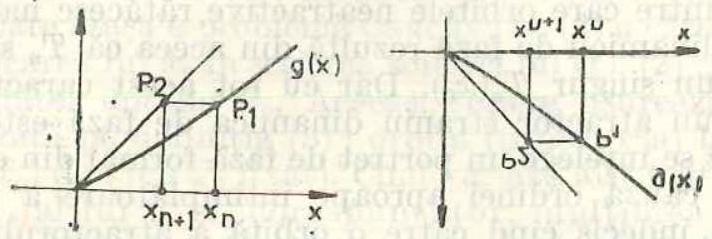 Sistemul dinamic este un concept geometric (de topologie diferențială) care modelează mișcarea (evoluția) unui sistem material cu ajutorul unei mulțimi infinite de transformări indexate după un număr natural n n nnn (în care caz sistemul se numeşte discret) sau după un parametru real t t ttt numit timp (în care caz sistemul dinamic este continuu). Deci, un sistem dinamic discret este o aplicative T : N C T : N C T:NrarrCT: \mathbb{N} \rightarrow \mathcal{C}T:NC, unde C C C\mathcal{C}C este mulțimea transformărilor T n : M M T n : M M T_(n):M rarr MT_{n}: M \rightarrow MTn:MM ale spatiului fazelor M M MMM care au proprietățile T n + m == T n T m m , n N T n + m == T n T m m , n N T_(n+m)==T_(n)@T_(m)m,n inNT_{n+m}= =T_{n} \circ T_{m} m, n \in \mathbb{N}Tn+m==TnTmm,nN iar T 0 T 0 T_(0)T_{0}T0 este transformarea identitate. T T TTT duce un număr natural n n nnn într-o funcţie T n T n T_(n)T_{n}Tn și anume T ( n ) = T n T ( n ) = T n T(n)=T_(n)T(n)=T_{n}T(n)=Tn. La rîndul ei funcția T n T n T_(n)T_{n}Tn duce orice element din M M MMM intr-un element din M M MMM. Aplicaţiile de interval g : [ a , b ] [ a , b ] , [ a , b ] R g : [ a , b ] [ a , b ] , [ a , b ] R g:[a,b]rarr[a,b],[a,b]subRg:[a, b] \rightarrow[a, b],[a, b] \subset \mathbb{R}g:[a,b][a,b],[a,b]R, generează sisteme dinamice discrete asociate unei rezolvări iterative a ecuației x = g ( x ) x = g ( x ) x=g(x)x=g(x)x=g(x) și anume T n ( x ) = g ( x n ) T n ( x ) = g x n T_(n)(x)=g(x_(n))T_{n}(x)=g\left(x_{n}\right)Tn(x)=g(xn), deci T n ( x ) = g n ( x 0 ) T n ( x ) = g n x 0 T_(n)(x)=g^(n)(x_(0))T_{n}(x)=g^{n}\left(x_{0}\right)Tn(x)=gn(x0) unde x 0 x 0 x_(0)x_{0}x0 este valoarea inițială din procesul iterativ, iar M = [ a , b ] M = [ a , b ] M=[a,b]M=[a, b]M=[a,b]. Aflarea soluției acestei ecuații revine la găsirea punctului fix ** al aplicației g g ggg. Dacă g g ggg este contracție, atunci un procedeu de aproximaţii succesive în care x n = g n ( x 0 ) x n = g n x 0 x_(n)=g^(n)(x_(0))x_{n}=g^{n}\left(x_{0}\right)xn=gn(x0) converge către x x x^(**)x^{*}x deci lim n x n = x lim n x n = x lim_(n rarr oo)x_(n)=x^(**)\lim _{n \rightarrow \infty} x_{n}=x^{*}limnxn=x pentru orice alegere a lui x 0 x 0 x_(0)x_{0}x0. In acest procedeu apare şirul x 0 , x 1 , x 2 , x 0 , x 1 , x 2 , x_(0),x_(1),x_(2),dotsx_{0}, x_{1}, x_{2}, \ldotsx0,x1,x2,, numit orbită sau traiectoria lui x 0 x 0 x_(0)x_{0}x0, definit deci ca T 0 ( x 0 ) , T 1 ( x 0 ) , T 2 ( x 0 ) , T 0 x 0 , T 1 x 0 , T 2 x 0 , T_(0)(x_(0)),T_(1)(x_(0)),T_(2)(x_(0)),dotsT_{0}\left(x_{0}\right), T_{1}\left(x_{0}\right), T_{2}\left(x_{0}\right), \ldotsT0(x0),T1(x0),T2(x0),, reprezentînd locul pozițiilor lui x 0 x 0 x_(0)x_{0}x0, cînd timpul discret n n nnn crește de la zero la oo\infty și deci descriind dinamica discretă a lui x 0 x 0 x_(0)x_{0}x0 în R R R\mathbb{R}R. Considerații geometrice simple arată că grafic x n + 1 x n + 1 x_(n+1)x_{n+1}xn+1 se construieşte ducînd din x n x n x_(n)x_{n}xn o perpendiculară pe axa x x xxx care înțeapă graficul lui g g ggg in P 1 P 1 P_(1)P_{1}P1. Din P 1 P 1 P_(1)P_{1}P1 se duce o paralelă