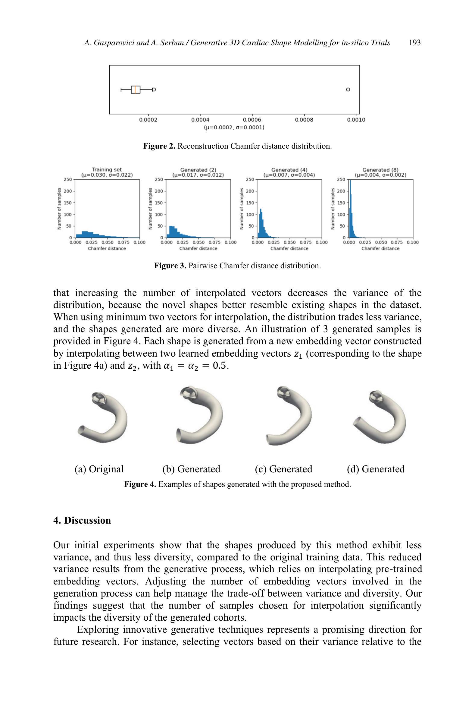 Shape generation. To evaluate the novelty of the generated shapes, we study the distribution of pairwise Chamfer distances (illustrated in Figure 3) on a set of 100 new shapes, generated by interpolating between 2,4 , and 8 embedding vectors. We observe