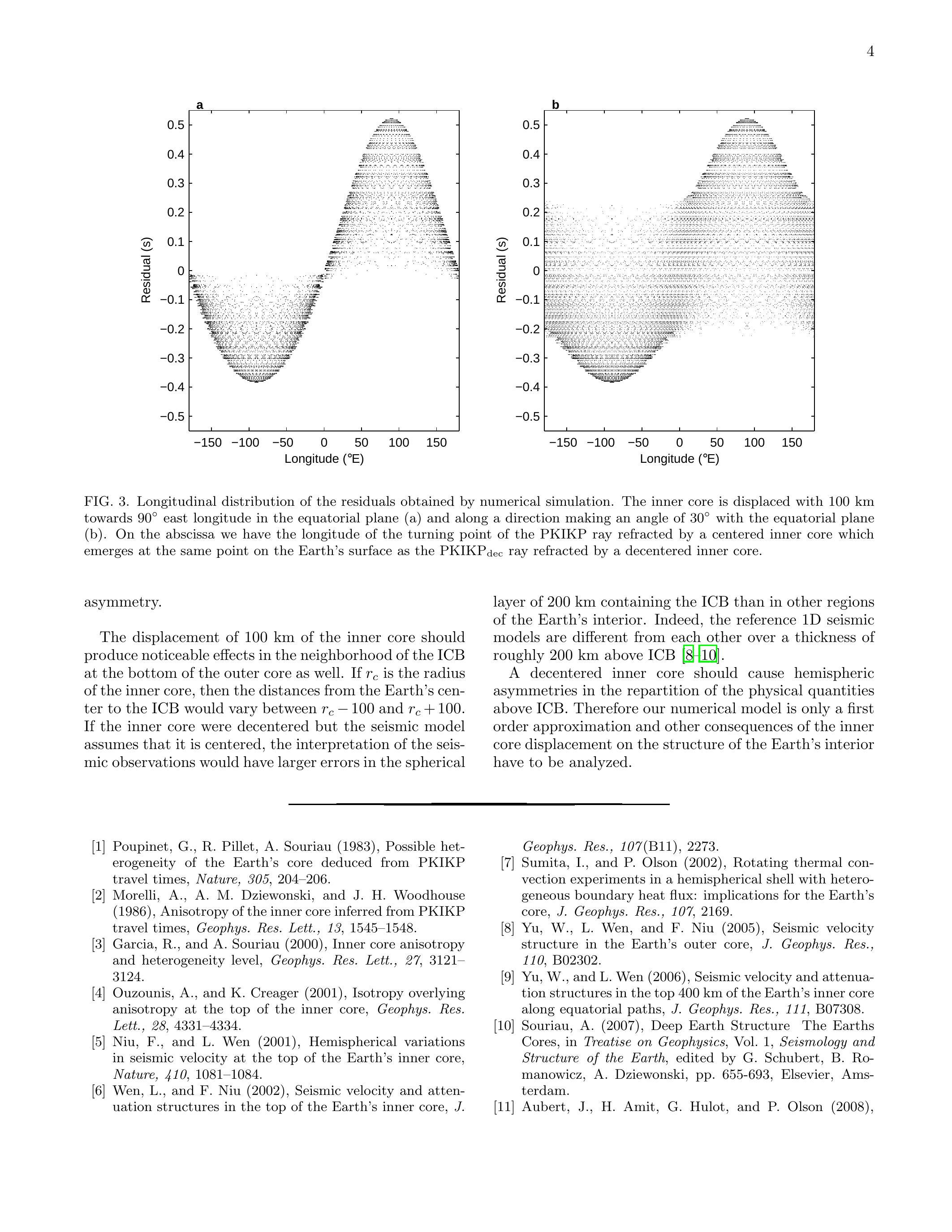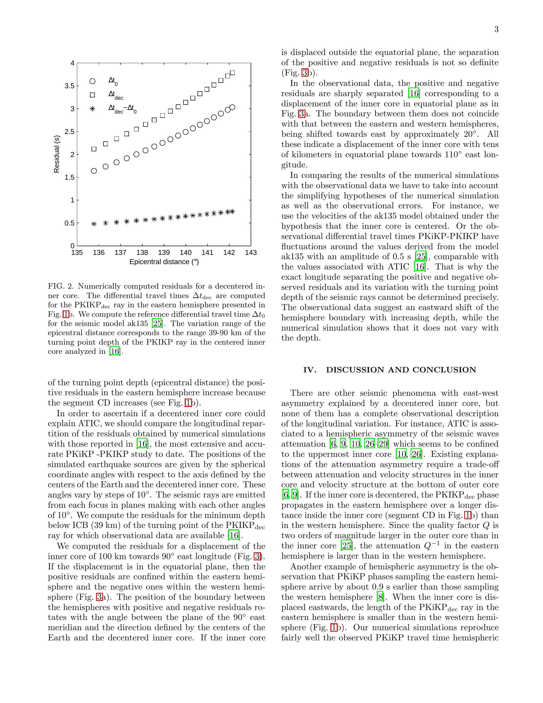 tive. In the diametrically opposite region of the inner core the distance CD is smaller than AB and the residual is negative, resulting in a hemispheric asymmetry. Hence, the asymmetry of the residuals of the differential travel time can be explained by the variation of the PKIKP
