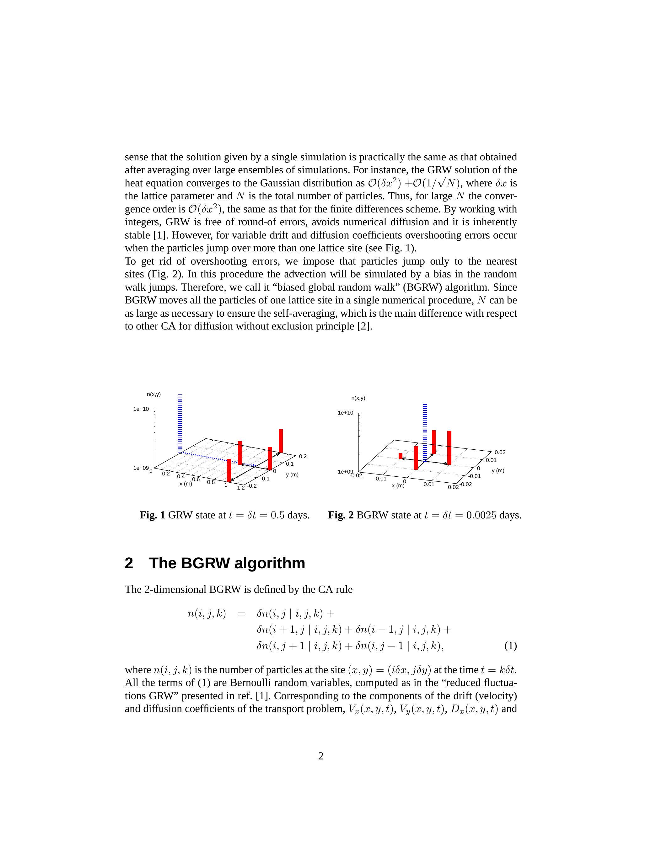 The Global Random Walk algorithm (GRW) is equivalent to a superposition of many particle tracking procedures. Starting with a given distribution of NN particles in a computational grid, all the particles lying at a grid site are simultaneously spread, first by an advection displacement, then by unbiased diffusion jumps, as shown in Fig. 1. GRW is a particular cellular automaton (CA), i.e. it is a stochastic process in the space of configurations, defined at a given time by the occupation numbers at each lattice site. In the GRW algorithm the number of particles per grid site is not limited by an "exclusion principle" and there are no limitations as to the total number of particles. Therefore, GRW is "self-averaging"in the