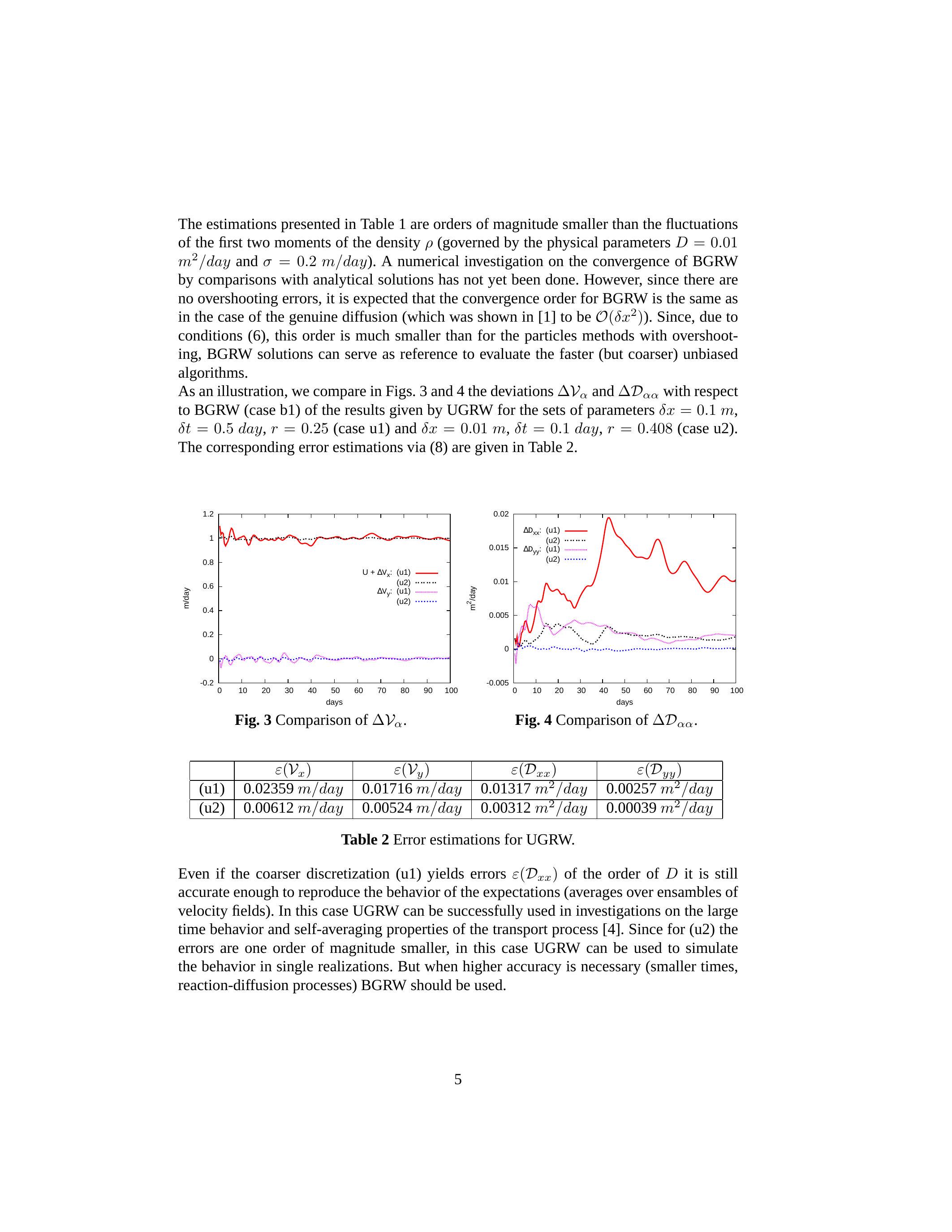 As an illustration, we compare in Figs. 3 and 4 the deviations DeltaV_(alpha)\Delta \mathcal{V}_{\alpha} and DeltaD_(alpha alpha)\Delta \mathcal{D}_{\alpha \alpha} with respect to BGRW (case b1) of the results given by UGRW for the sets of parameters delta x=0.1 m\delta x=0.1 m, delta t=0.5 day,r=0.25\delta t=0.5 d a y, r=0.25 (case u1) and delta x=0.01 m,delta t=0.1 day,r=0.408\delta x=0.01 m, \delta t=0.1 d a y, r=0.408 (case u2). The corresponding error estimations via (8) are given in Table 2.