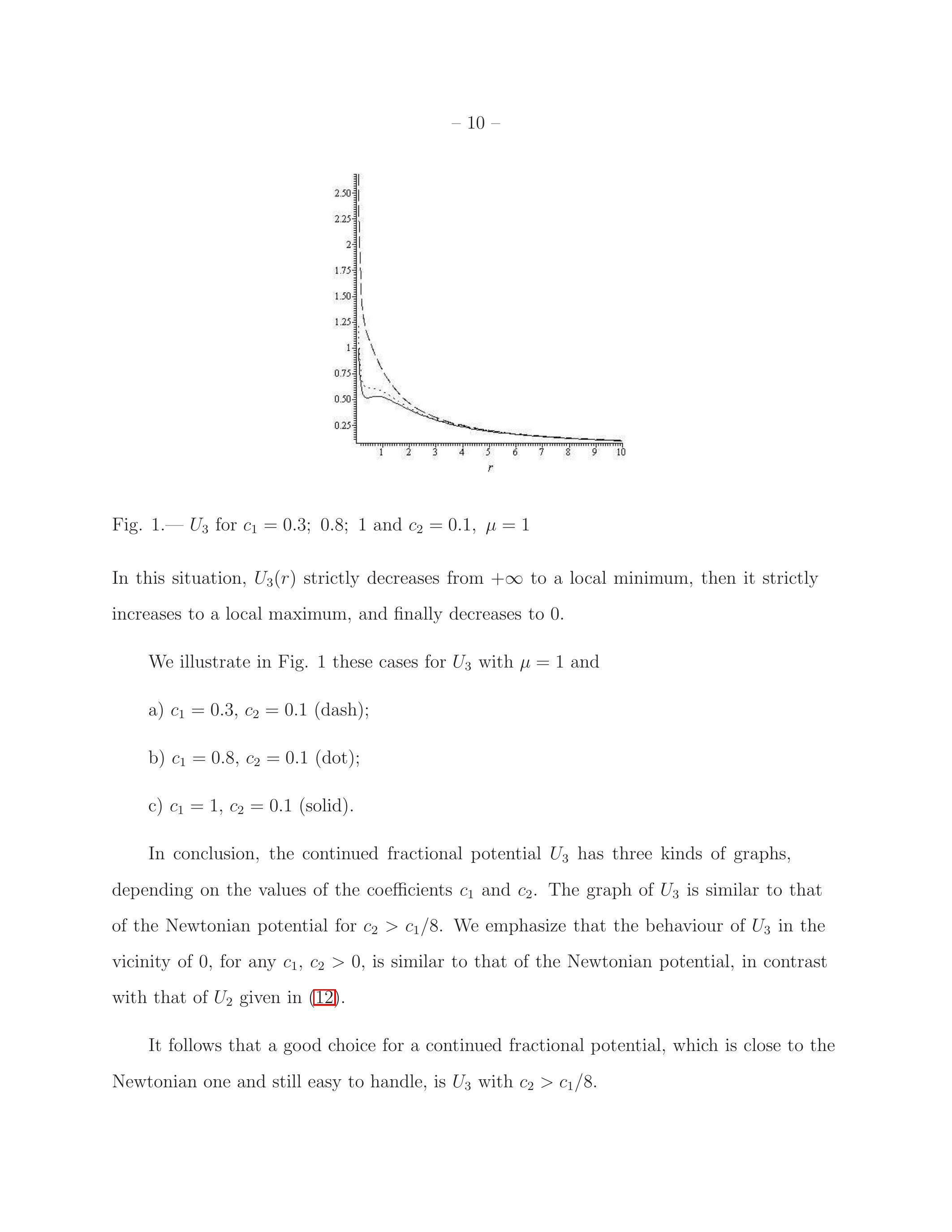 In conclusion, the continued fractional potential U_(3)U_{3} has three kinds of graphs, depending on the values of the coefficients c_(1)c_{1} and c_(2)c_{2}. The graph of U_(3)U_{3} is similar to that of the Newtonian potential for c_(2) > c_(1)//8c_{2}>c_{1} / 8. We emphasize that the behaviour of U_(3)U_{3} in the vicinity of 0 , for any c_(1),c_(2) > 0c_{1}, c_{2}>0, is similar to that of the Newtonian potential, in contrast with that of U_(2)U_{2} given in (12).