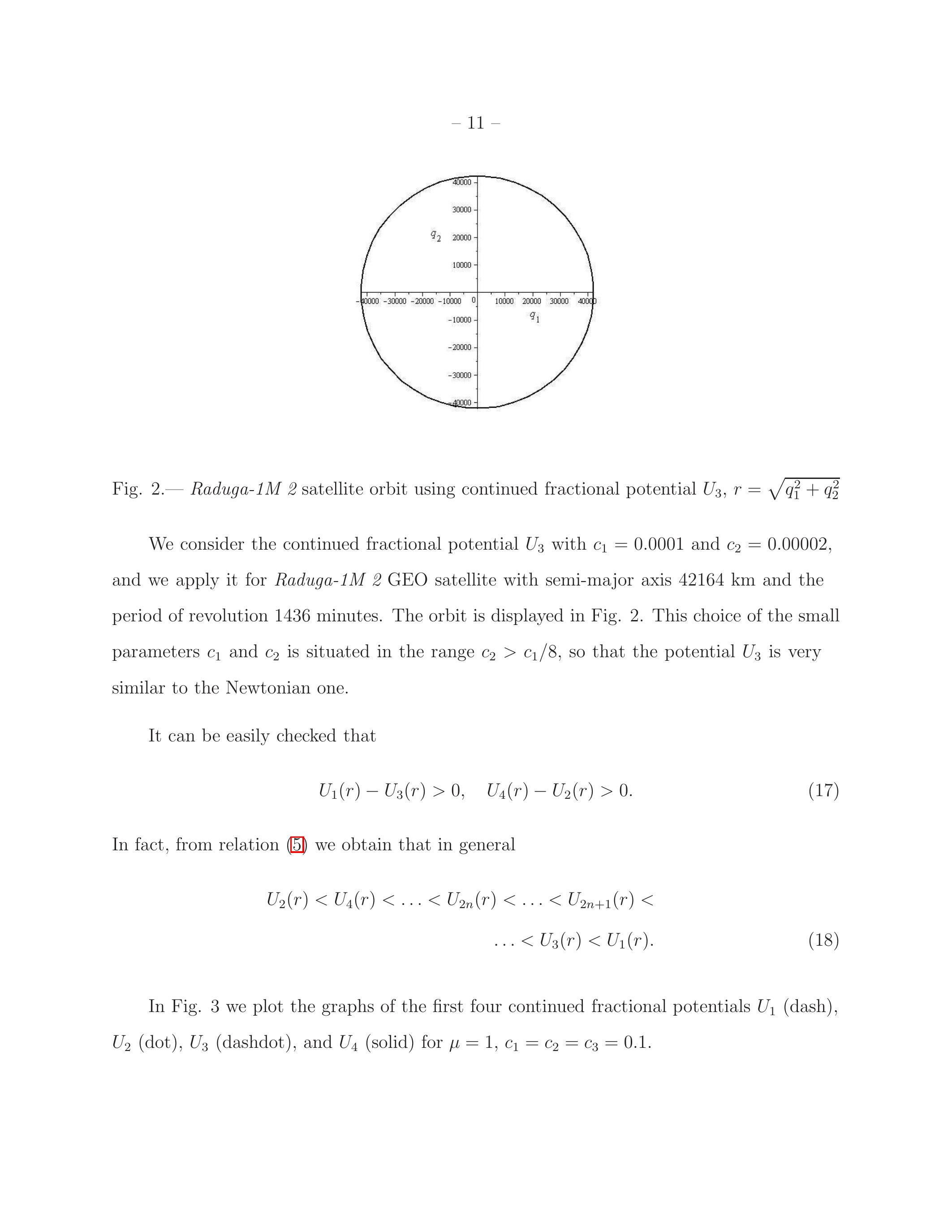We consider the continued fractional potential U_(3)U_{3} with c_(1)=0.0001c_{1}=0.0001 and c_(2)=0.00002c_{2}=0.00002, and we apply it for Raduga-1M 2 GEO satellite with semi-major axis 42164 km and the period of revolution 1436 minutes. The orbit is displayed in Fig. 2. This choice of the small parameters c_(1)c_{1} and c_(2)c_{2} is situated in the range c_(2) > c_(1)//8c_{2}>c_{1} / 8, so that the potential U_(3)U_{3} is very similar to the Newtonian one.