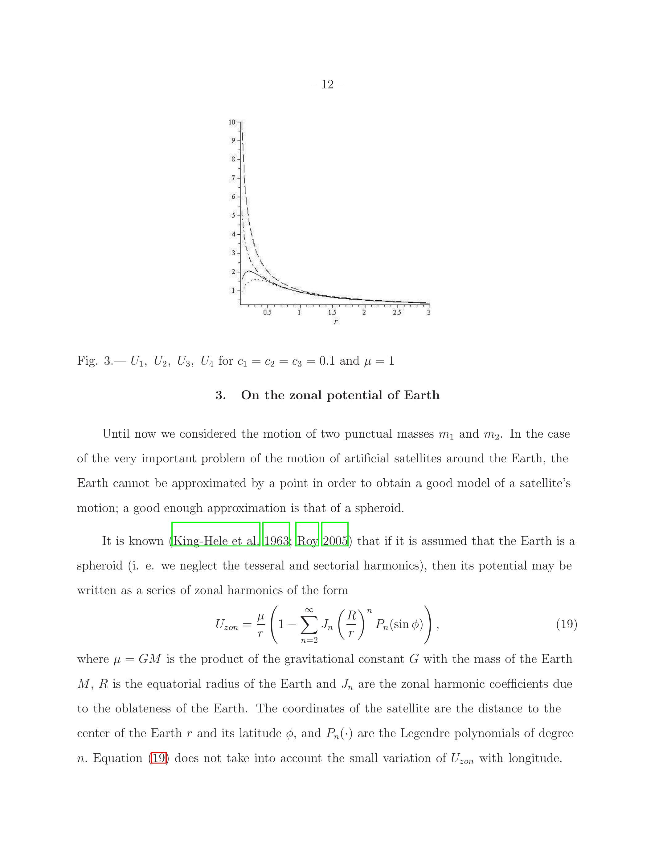 The main properties of the Newtonian potential are preserved by some of its corrected potentials: the continued fractional potential U_(3)U_{3} given by (121), for c_(2) > c_(1)//8 > 0c_{2}>c_{1} / 8>0; the zonal potential of Earth UU given by (21). It is worth noting that in the case of the continued fraction potential U_(3)U_{3} we have at our disposal two parameters c_(1)c_{1} and c_(2)c_{2}. These can be used to adjust the potential when we have information on the motion of the satellite. The figures illustrate the possible situations which have been proved analytically.