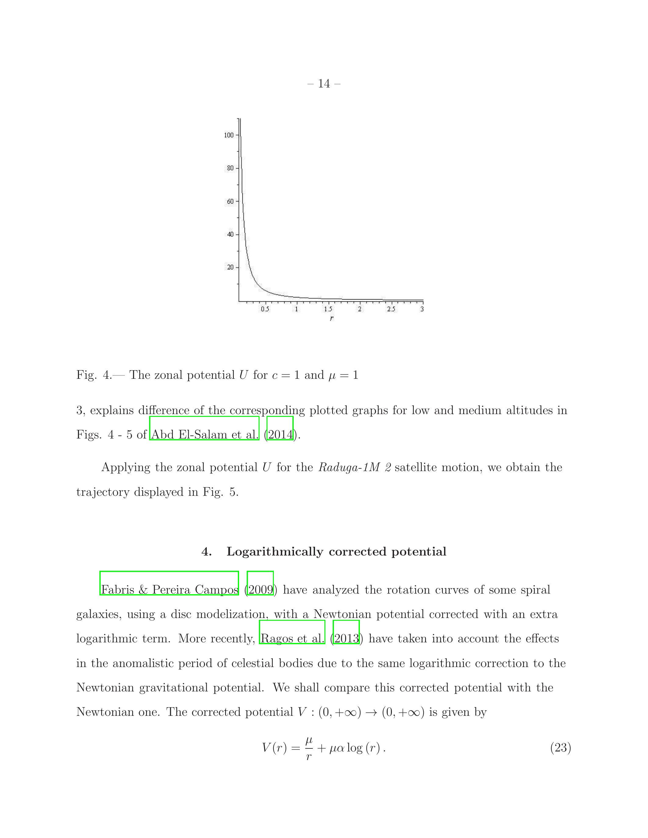 The first derivative of UU is negative and its second derivative is positive on ( 0,+oo0,+\infty ), hence the potential UU decreases from its limit in 0 , which is +oo+\infty, to its limit 0 as r rarr+oor \rightarrow+\infty. Therefore, the zonal potential UU has a graph similar to the Newtonian one, as it may be seen in Fig. 4, for mu=1\mu=1 and c=1c=1. For the sake of completeness, we study also the case of c < 0c<0. The first derivative of UU has now the positive root sqrt(-3c)\sqrt{-3 c}, and the second derivative of VV has the positive root sqrt(-6c)\sqrt{-6 c}. It follows that the potential UU increases from its limit in 0 , which is equal with -oo-\infty to U(sqrt(-3c)) > 0U(\sqrt{-3 c})>0 and then it decreases to 0 as r rarr+oor \rightarrow+\infty, having an inflection point at sqrt(-6c)\sqrt{-6 c}. So, whatever the negative value of the constant cc is, the graph of the zonal-type potential VV looks different from that of the Newtonian potential.