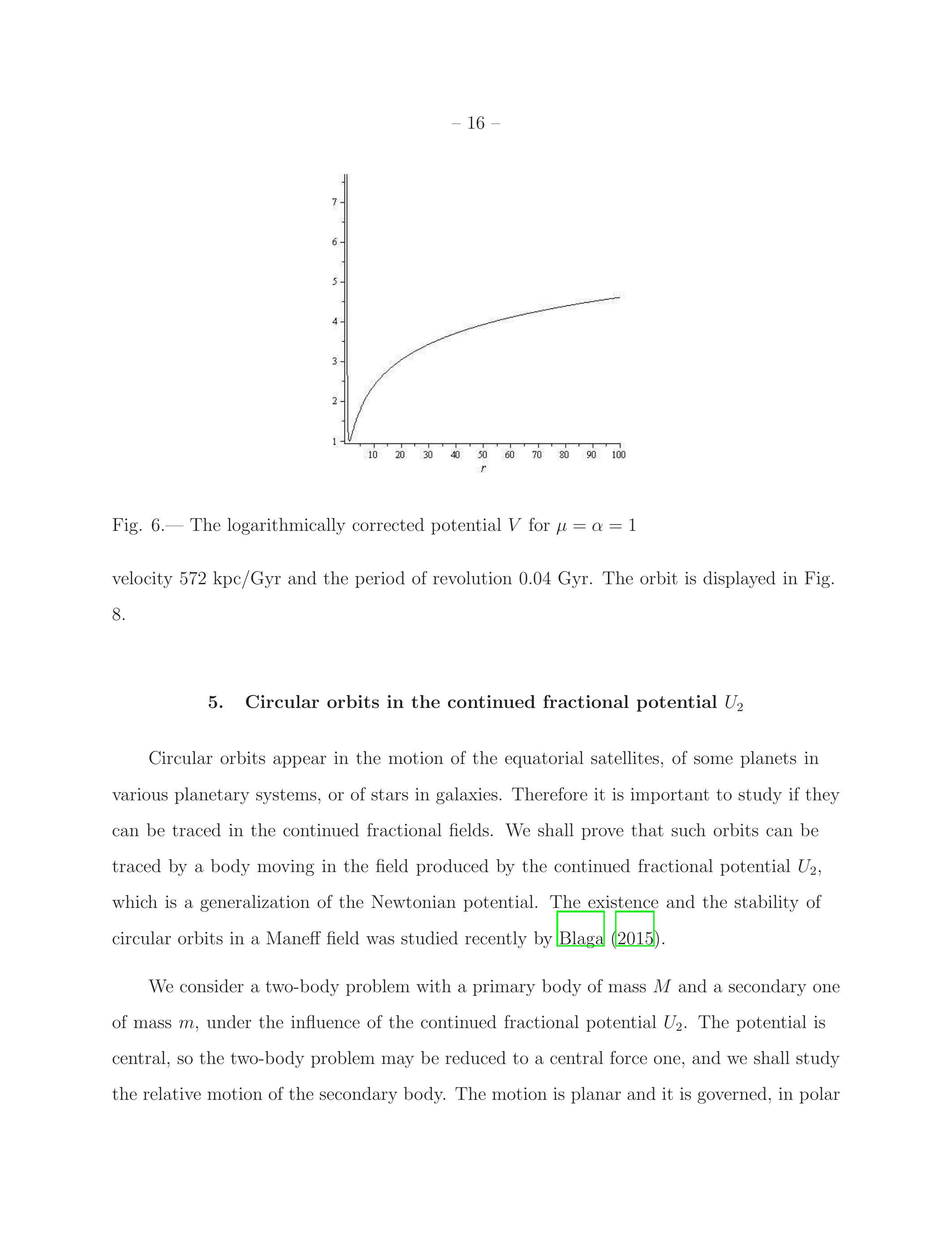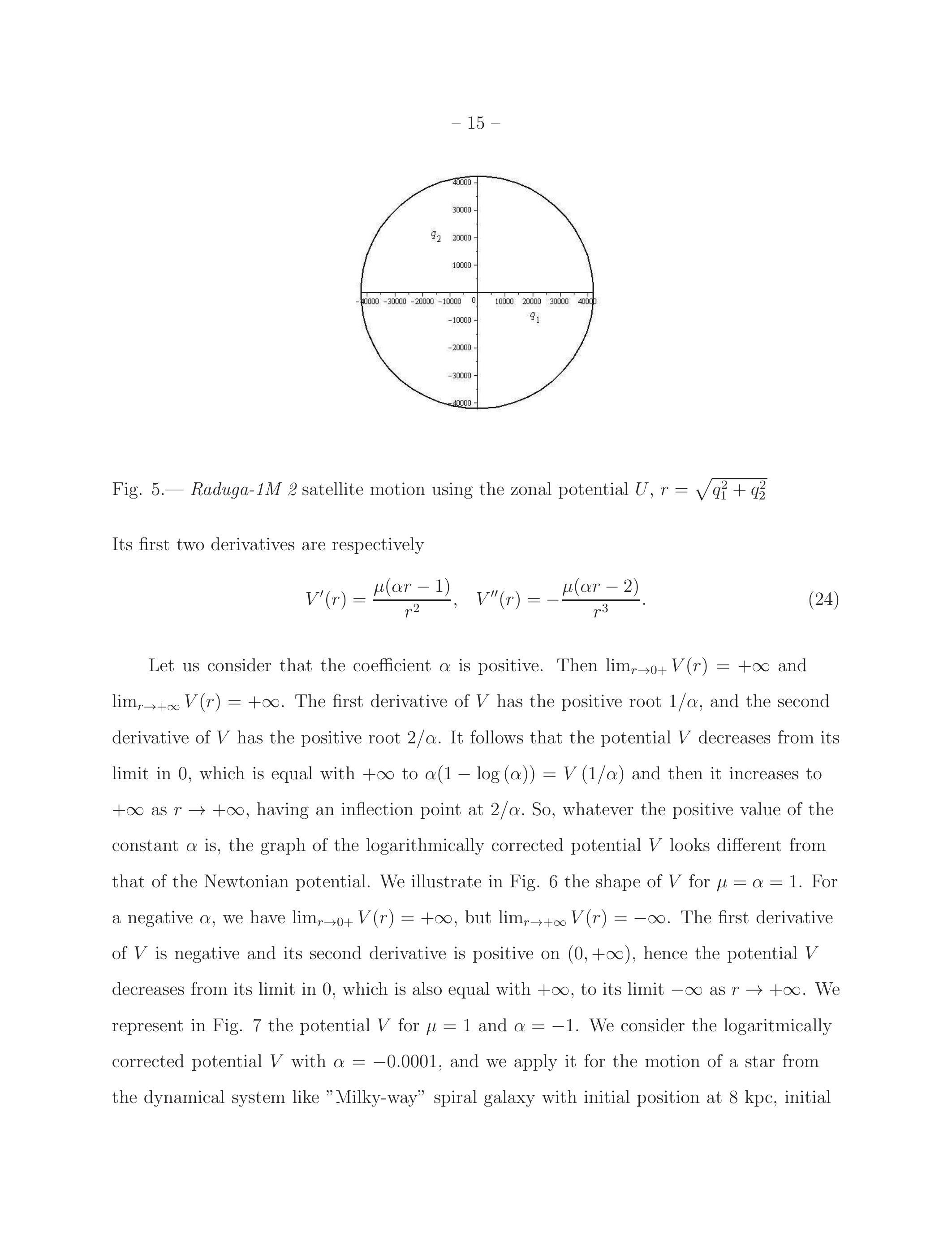 Let us consider that the coefficient alpha\alpha is positive. Then lim_(r rarr0+)V(r)=+oo\lim _{r \rightarrow 0+} V(r)=+\infty and lim_(r rarr+oo)V(r)=+oo\lim _{r \rightarrow+\infty} V(r)=+\infty. The first derivative of VV has the positive root 1//alpha1 / \alpha, and the second derivative of VV has the positive root 2//alpha2 / \alpha. It follows that the potential VV decreases from its limit in 0 , which is equal with +oo+\infty to alpha(1-log(alpha))=V(1//alpha)\alpha(1-\log (\alpha))=V(1 / \alpha) and then it increases to +oo+\infty as r rarr+oor \rightarrow+\infty, having an inflection point at 2//alpha2 / \alpha. So, whatever the positive value of the constant alpha\alpha is, the graph of the logarithmically corrected potential VV looks different from that of the Newtonian potential. We illustrate in Fig. 6 the shape of VV for mu=alpha=1\mu=\alpha=1. For a negative alpha\alpha, we have lim_(r rarr0+)V(r)=+oo\lim _{r \rightarrow 0+} V(r)=+\infty, but lim_(r rarr+oo)V(r)=-oo\lim _{r \rightarrow+\infty} V(r)=-\infty. The first derivative of VV is negative and its second derivative is positive on ( 0,+oo0,+\infty ), hence the potential VV decreases from its limit in 0 , which is also equal with +oo+\infty, to its limit -oo-\infty as r rarr+oor \rightarrow+\infty. We represent in Fig. 7 the potential VV for mu=1\mu=1 and alpha=-1\alpha=-1. We consider the logaritmically corrected potential VV with alpha=-0.0001\alpha=-0.0001, and we apply it for the motion of a star from the dynamical system like "Milky-way" spiral galaxy with initial position at 8 kpc , initial