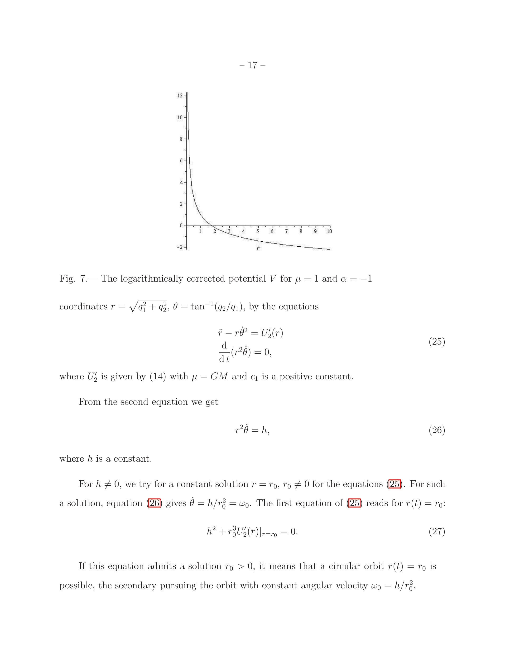 If this equation admits a solution r_(0) > 0r_{0}>0, it means that a circular orbit r(t)=r_(0)r(t)=r_{0} is possible, the secondary pursuing the orbit with constant angular velocity omega_(0)=h//r_(0)^(2)\omega_{0}=h / r_{0}^{2}.