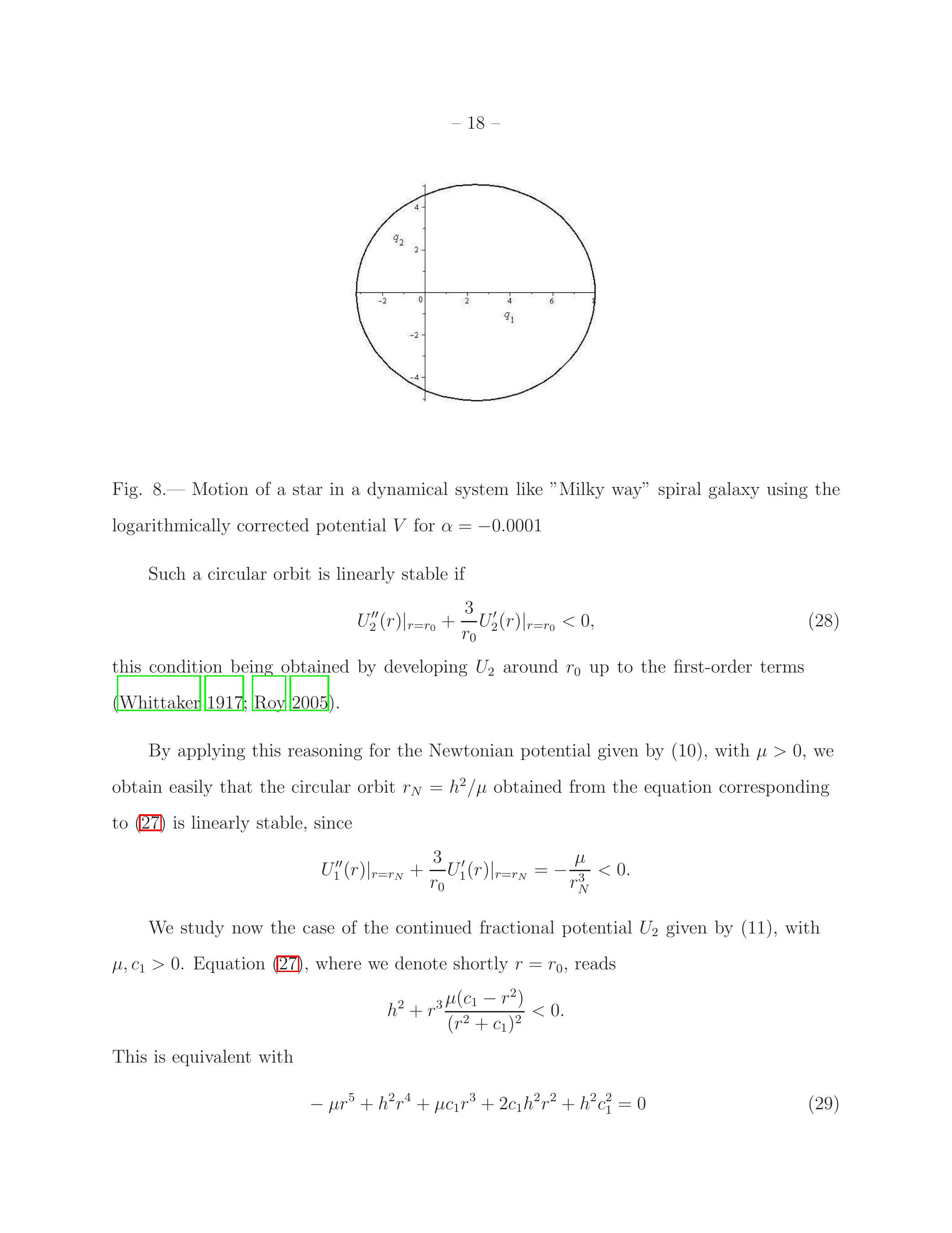 and this fifth degree equation cannot be solved in general. Nevertheless, we remark that all the coefficients, excepting that of r^(5)r^{5}, are positive. It follows that there is precisely one change of sign in the row of the coefficients. Applying the Descartes rule of signs (Korn & Korn 2000) it follows that equation (29) has at most one positive solution. But for r=0r=0 the left hand side of (29) is equal to h^(2)c_(1)^(2) > 0h^{2} c_{1}^{2}>0, and its limit to infinity is -oo-\infty, hence equation (29) has a unique solution r=r_(0)r=r_{0}. Moreover, for r_(N)=h^(2)//mur_{N}=h^{2} / \mu the left hand side of (29) is positive, which means that r_(0) > r_(N)r_{0}>r_{N}, i. e. the radius of the circular orbit in the fractional potential U_(2)U_{2} is greater than the similar one traced in the Newtonian potential.