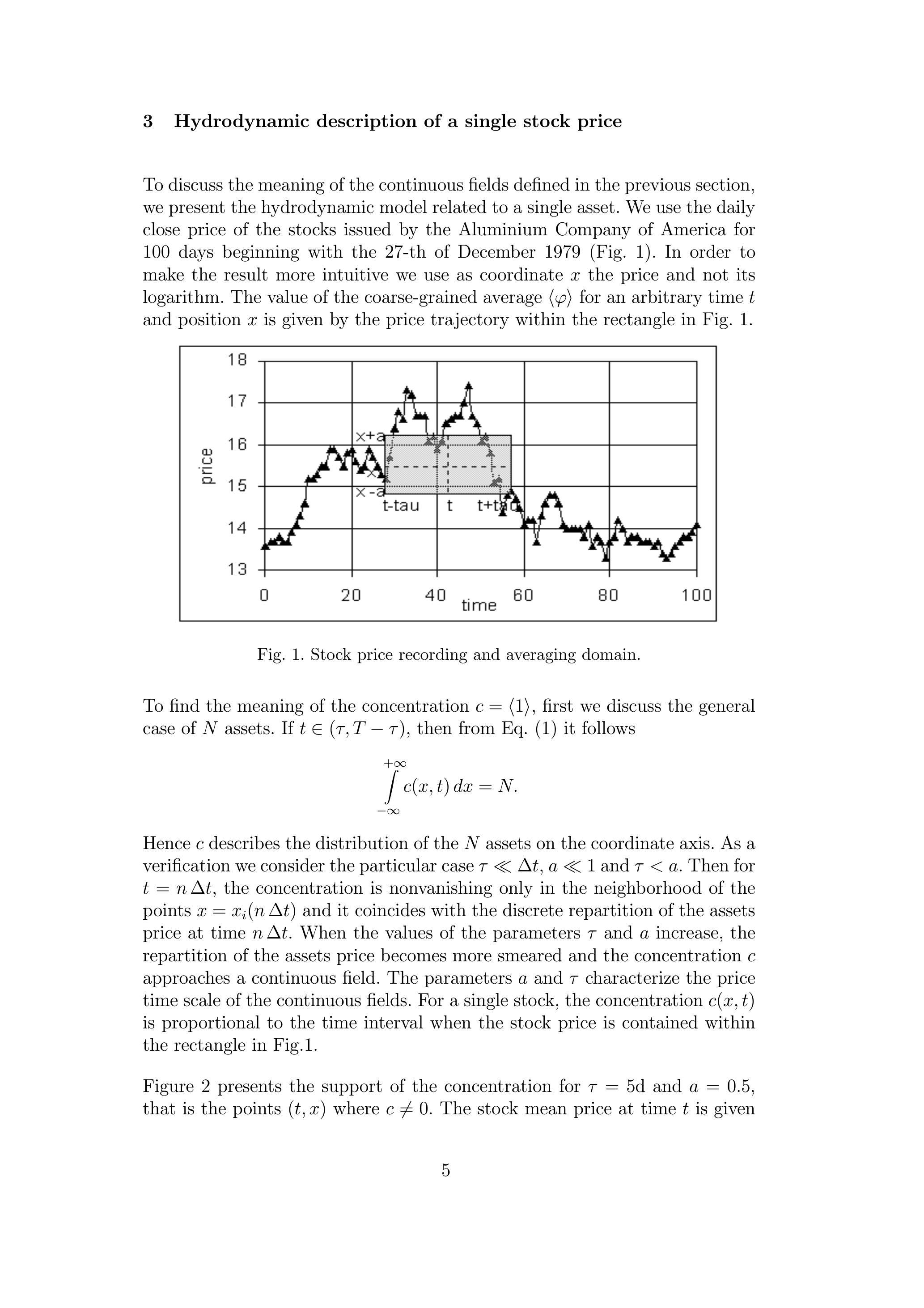 To discuss the meaning of the continuous fields defined in the previous section, we present the hydrodynamic model related to a single asset. We use the daily close price of the stocks issued by the Aluminium Company of America for 100 days beginning with the 27-th of December 1979 (Fig. 1). In order to make the result more intuitive we use as coordinate xx the price and not its logarithm. The value of the coarse-grained average (:varphi:)\langle\varphi\rangle for an arbitrary time tt and position xx is given by the price trajectory within the rectangle in Fig. 1.