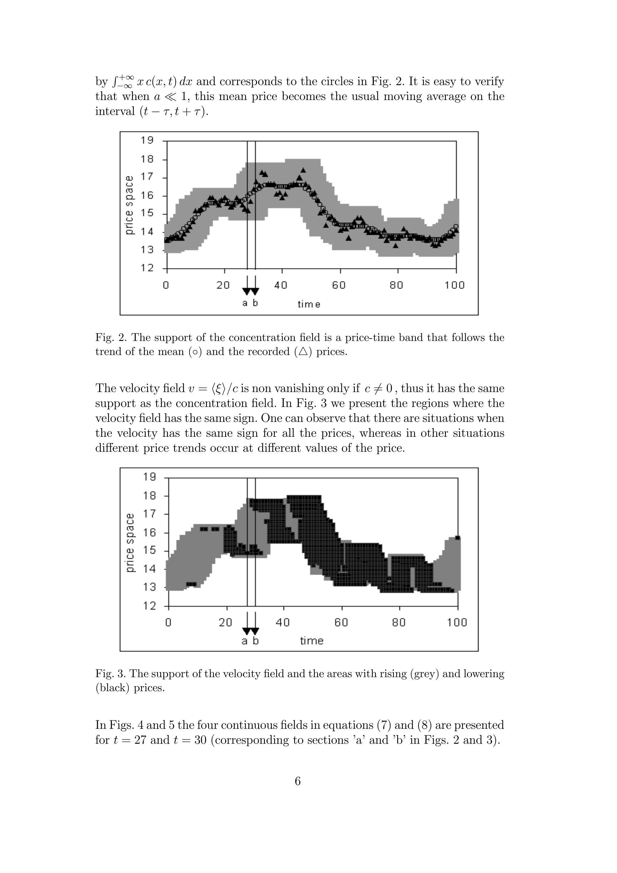 The velocity field v=(:xi:)//cv=\langle\xi\rangle / c is non vanishing only if c!=0c \neq 0, thus it has the same support as the concentration field. In Fig. 3 we present the regions where the velocity field has the same sign. One can observe that there are situations when the velocity has the same sign for all the prices, whereas in other situations different price trends occur at different values of the price.