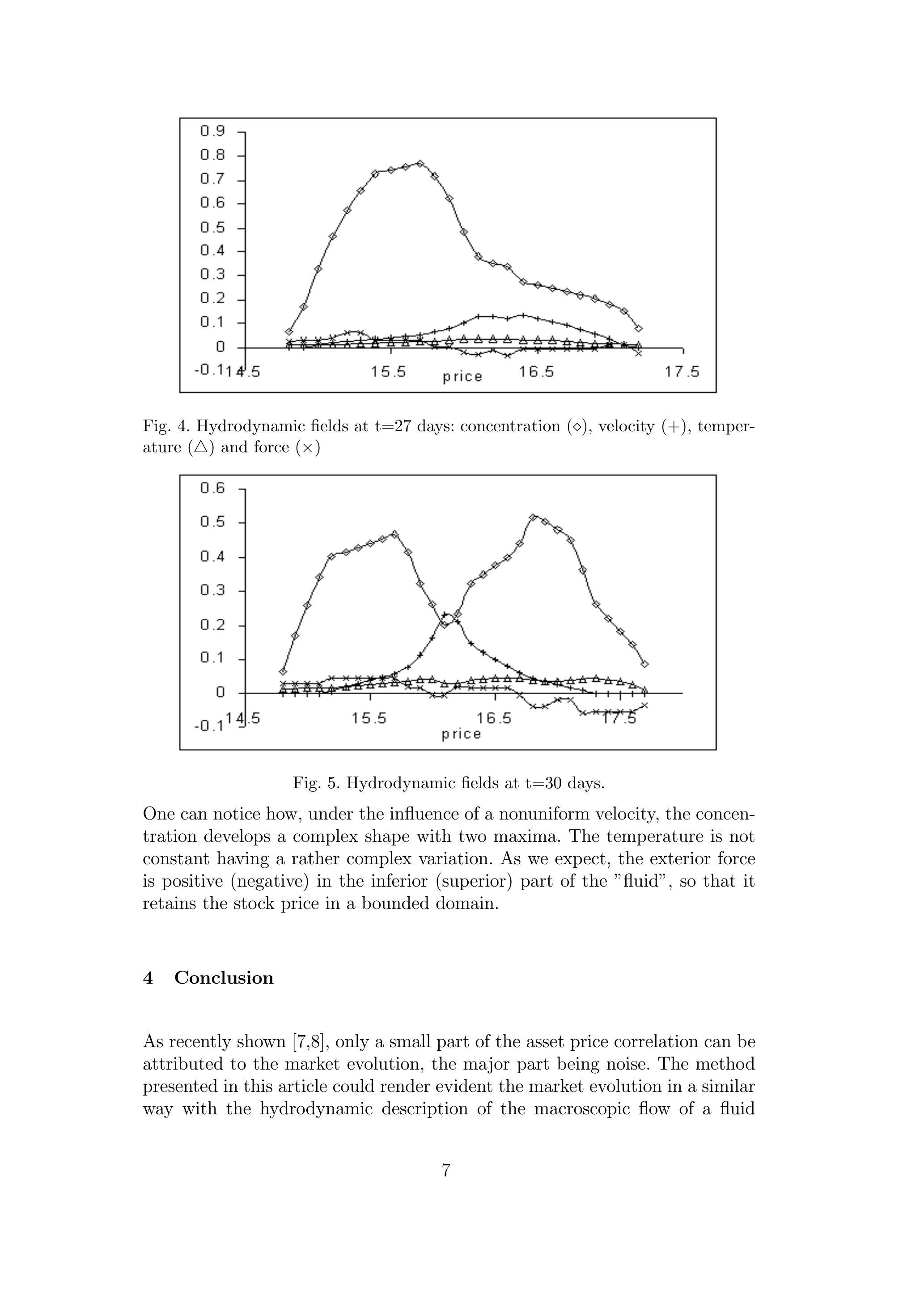 However, as shown in [4,5][4,5], the hydrodynamic type description can be obtained for any corpuscular system with a kinematic description. The continuous fields are obtained as space-time coarse-grained averages, and they satisfy the hydrodynamic equations. This method can be used for the molecules of a fluid, as well as for the asset price. If the number of the particles is very large and they form a thermodynamic system satisfying local equilibrium, then the usual hydrodynamic description is obtained. But the coarse-grained averages can be calculated for an arbitrary number of particles (even for a single particle) and they give a hydrodynamic description even for mechanical systems having no statistical properties characteristic to a thermodynamic system [6].