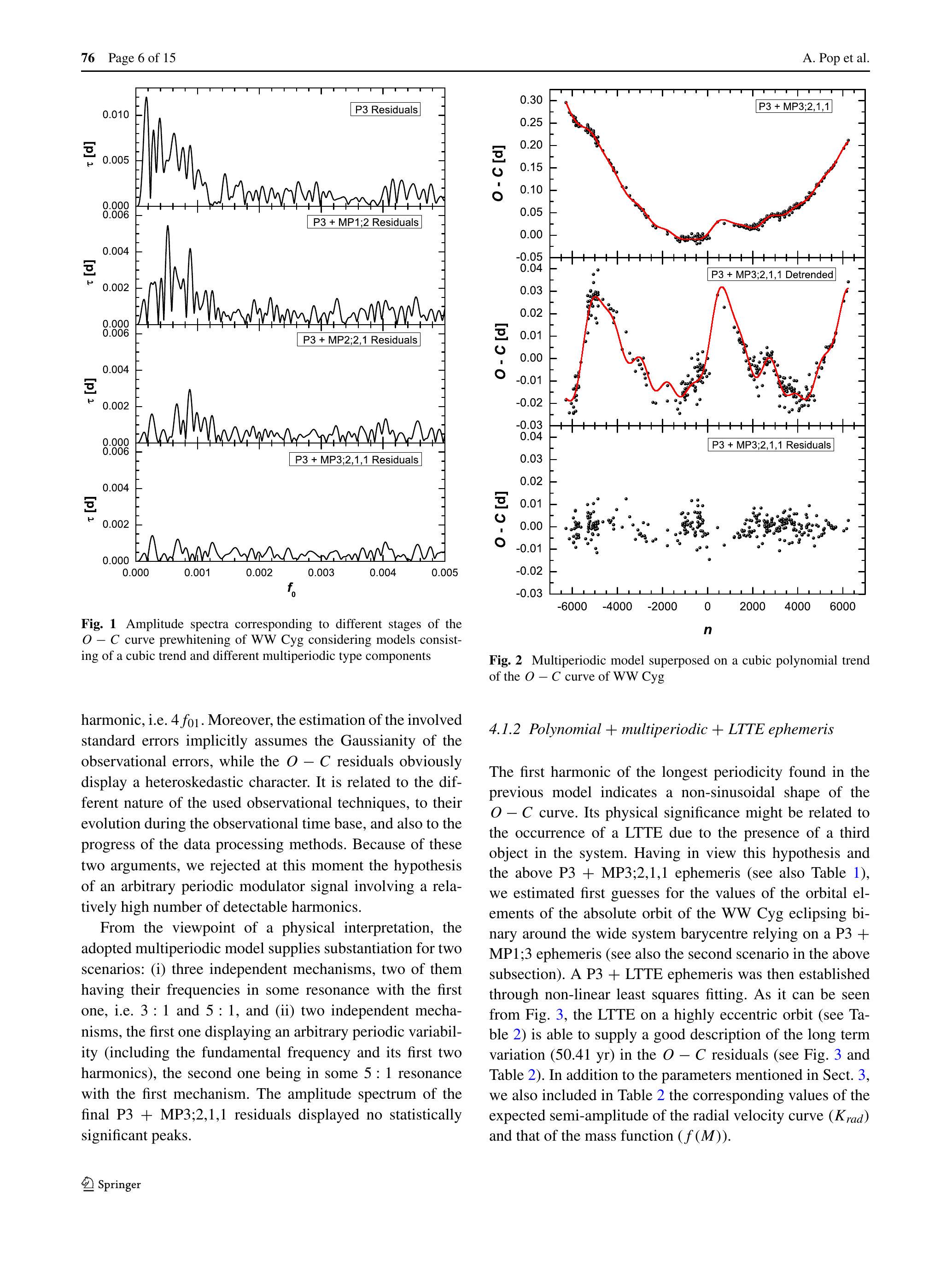 Taking into account the already proved multiperiodicity of this O-CO-C curve, we considered for further refinements the superposition of LTTE and some low amplitude periodic components. We were able to establish a final model consisting in the following four periodicities (in the order of their detection): 50.56 yr (LTTE), 17.58yr,12.41yr17.58 \mathrm{yr}, 12.41 \mathrm{yr}, and 33.5 yr . However, the evolution of some details in the amplitude spectra of the successive residuals revealed the inad-