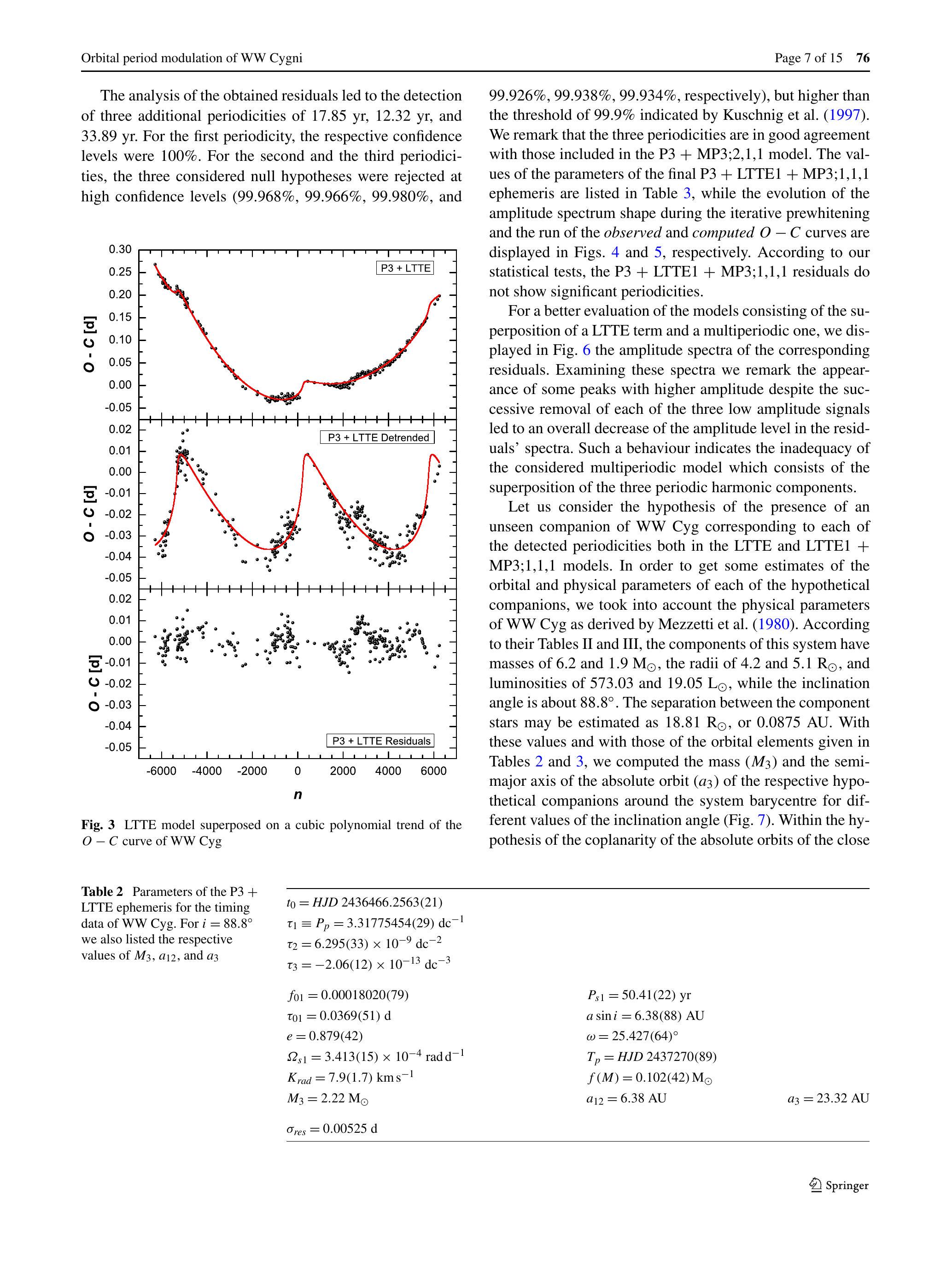 that given by Prager, but with a smaller amplitude. The discussion on the periodic character of the orbital period variation of WW Cyg was later resumed by Nason and Moore (1951) who found a period yet longer of 45.4 yr , the corresponding amplitude being of 0.026 d . They also invoked the apsidal motion as a possible cause of this alternating period change. Whitney (1957) examined the timing data covering a relatively short time base of about 11 yr and found a possible orbital period variation with a period of about 6.8 yr , and an amplitude of 0.008 d . Wood and Forbes (1963) computed the elements of a cubic ephemeris for WW Cyg. Note that it is well-known that a third order polynomial model is able to describe a piece of a sinusoid with a length of about one cycle (e.g. Skillman and Patterson 1988, Applegate and Shaham 1994). Hall and Wawrukiewicz (1972) remarked that a strictly periodic model may describe the O-CO-C residuals for timing data recorded earlier than 1960, but it fails to fit the more recent data. Thus, they concluded that the orbital period variation of WW Cyg is not sinusoidal. Consequently, in order to describe the more and more complicated shape of the curve, they hypothesized the existence of seven abrupt period changes in this binary system. Finally, Zavala et al. (2002) emphasized the presence of a secular parabolic trend in the O-CO-C residuals, which corresponds to a linear increase of the orbital period of WW Cyg. Then, they analysed the alternating pattern of the detrended residuals (see Fig. 5 in Zavala et al. 2002), but only by computing their Fourier spectrum. They found an orbital period modulation phenomenon with a periodicity of about 56.4 yr , and amplitude of 0.0187 d . Due to the fact that the eccentricity of the system is zero (Struve 1946; Hall and Wawrukiewicz 1972), the hypothesis of apsidal motion has been rejected. Thus, Zavala et al. (2002) considered as a possible cause of this modulation the light travel time effect (LTTE) caused by the presence of an unseen companion. They performed some numerical tests concerning the possible amplitude of the first harmonic of the above periodicity, but they did not succeed to obtain a representation of the O-CO-C curve via LTTE on an elliptical orbit. Consequently, they also rejected this mechanism as an explanation of the orbital period modulation of WW Cyg. Moreover, they noted the lack of strict periodicity of the O-CO-C residuals obtained after removing a strictly periodic component with the period of 56.4 yr . Therefore, they concluded that the existence of magnetic cycles within the secondary component of the system may explain the observed variability displayed by the O-CO-C residuals (see also Zavala et al. 2004, Zavala 2005).