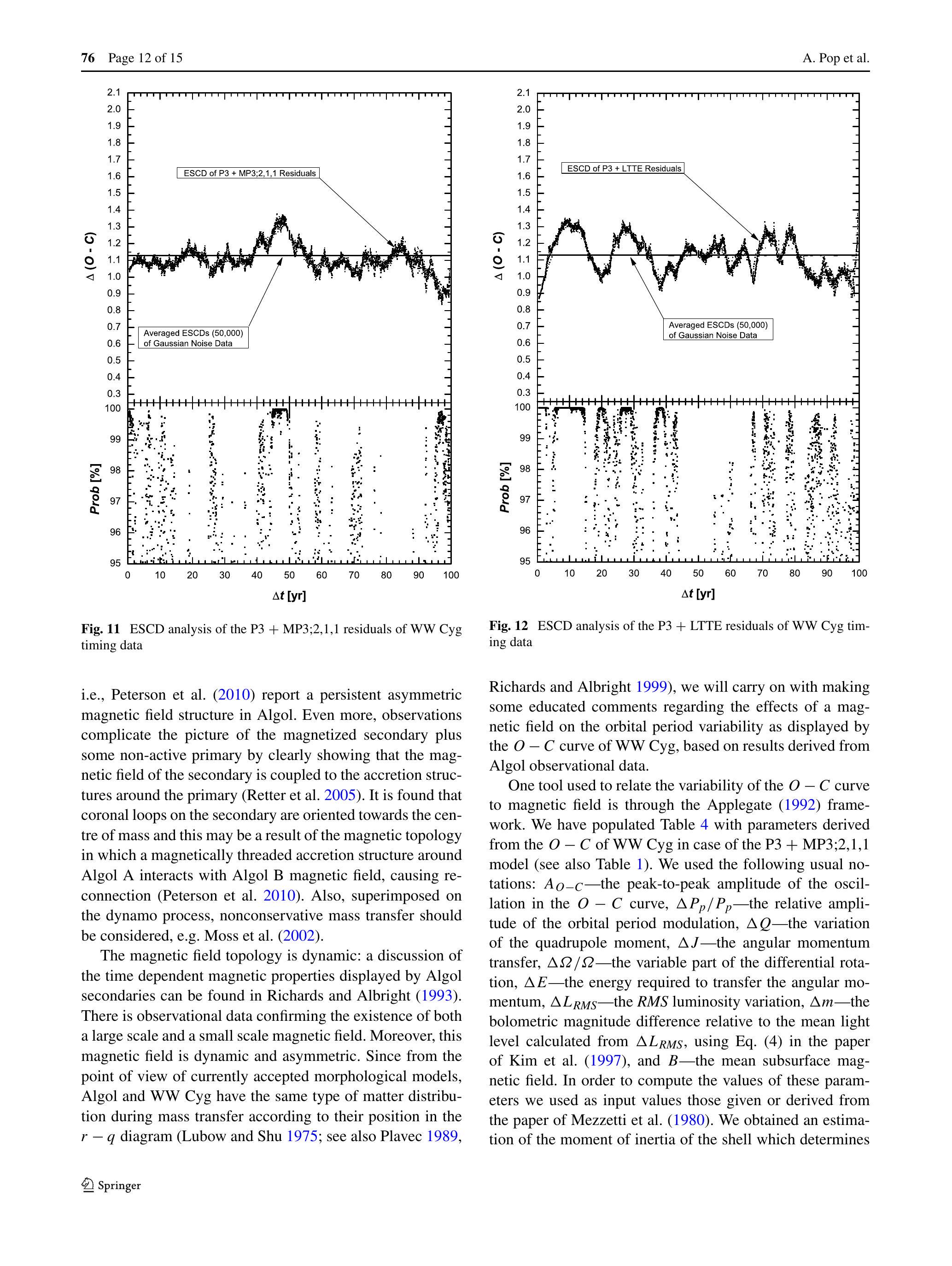 Table 4 Interpretation within P3 + MP3;2,1,1 of the periodicities detected in the timing data of WW Cyg through the theory of Applegate (1992)