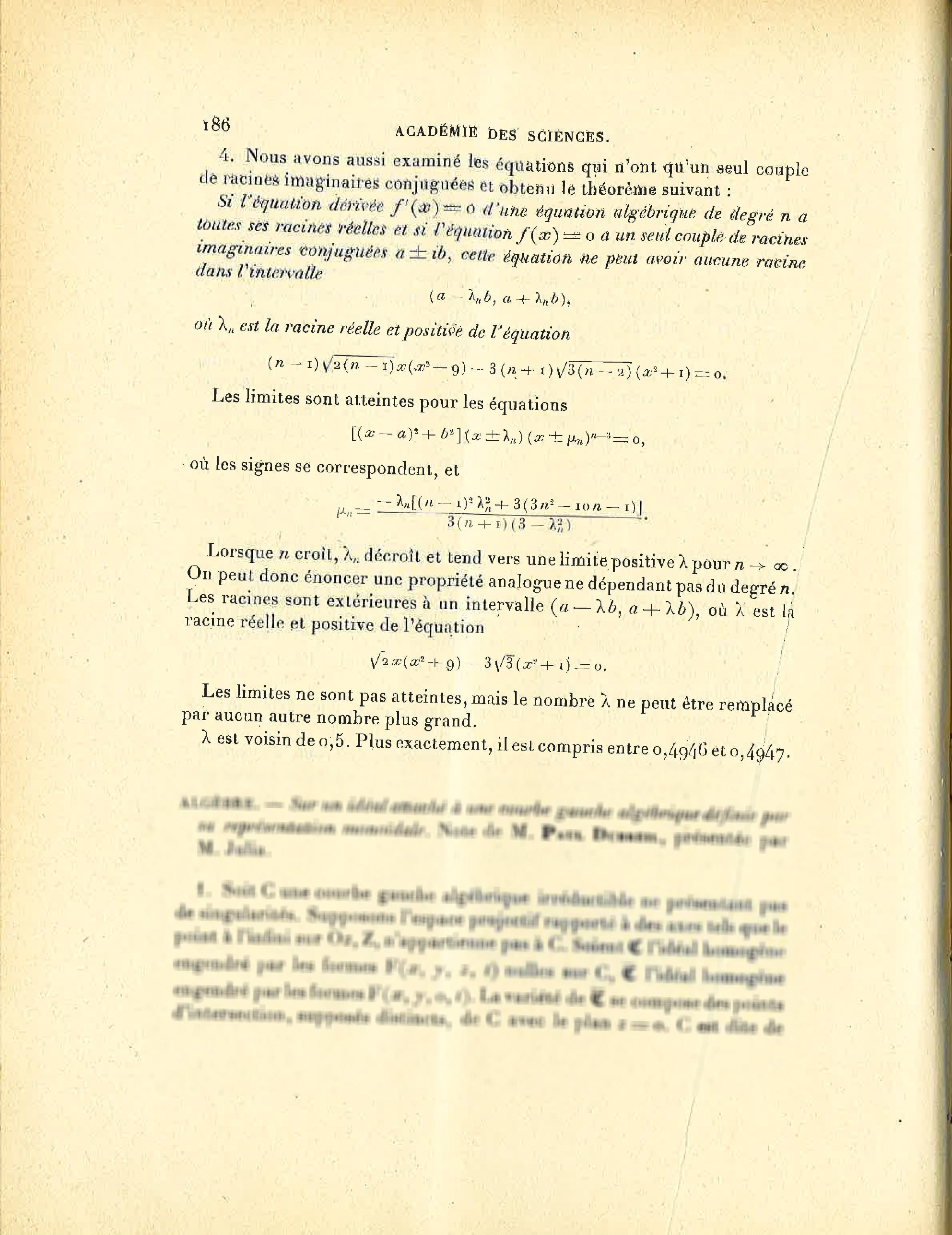 Les limites ne sont pas atteintes, mais le nombre lambda\lambda ne peut être remplacé par aucun autre nombre plus grand. lambda\lambda est voisin de o,5. Plus exactement, il est compris entre o,4946 et o,4947. M. Jullia.