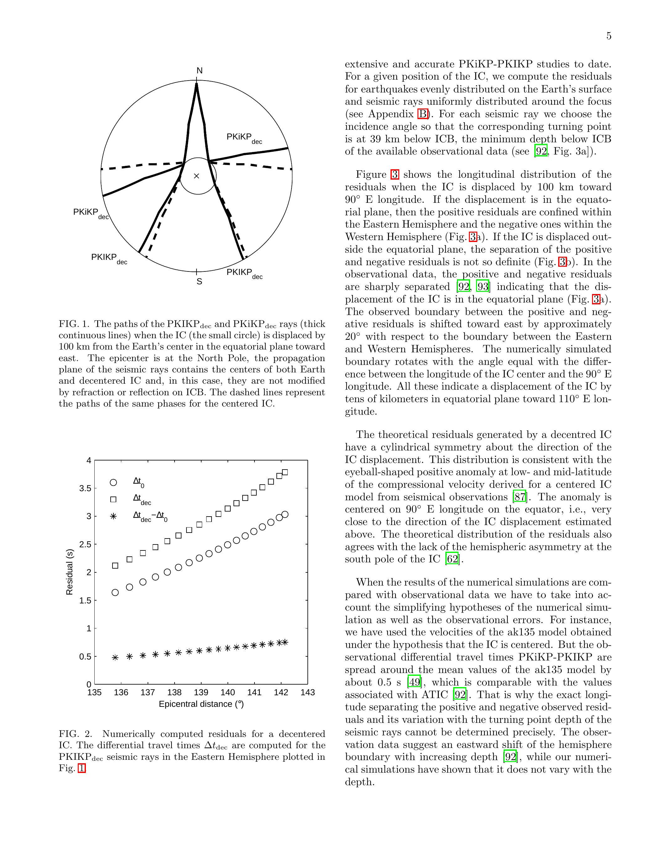 We have approached most of the above issues qualitatively and explained two of them (ATIC and the attenuation asymmetry) through rigorous numerical simulations of differential travel times sampling the top of the IC. In conclusion, we estimate that the displacement of the IC could be larger than 3 km and smaller than 100 km , most likely equal to several tens of kilometers. The estimated direction of the displacement varies between 110^(@)E110^{\circ} \mathrm{E} and 160^(@)E160^{\circ} \mathrm{E}. The time scale of the translational motion of the IC could be larger than several hundreds of years. The resulting picture is that of a perturbation generated by the decentered IC which enhances the nonequilibrium and the nonhydrostaticity of the well-established basic structure of the Earth. We consider that more flexible dynamical models of the Earth's interior could be obtained by simply letting the IC to participate in the movement of the OC .