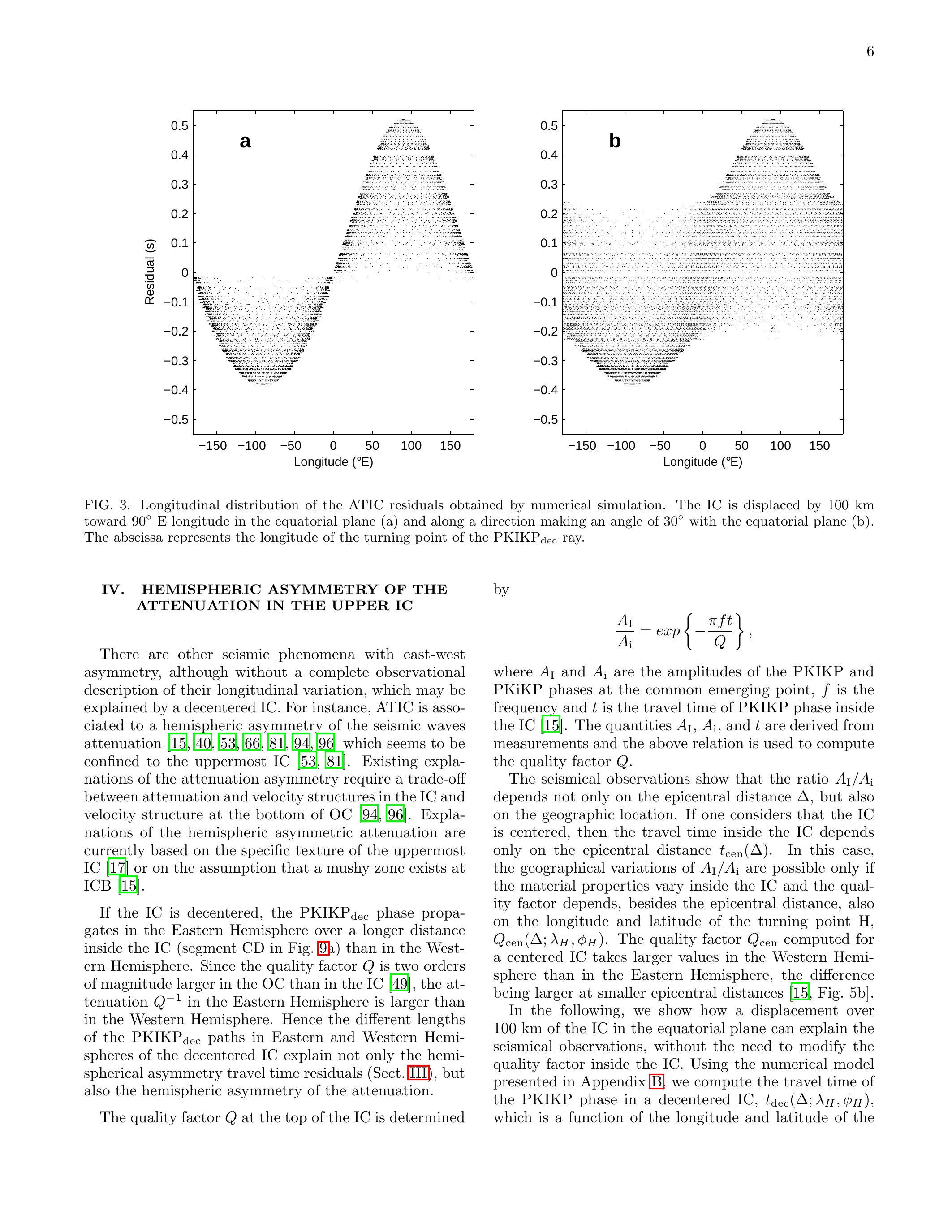sive data set of PKIKP travel times, Lythgoe et al. conclude that there is no clear evidence of an innermost IC and the hemispherical variation of the anisotropy extends through the entire IC 55].