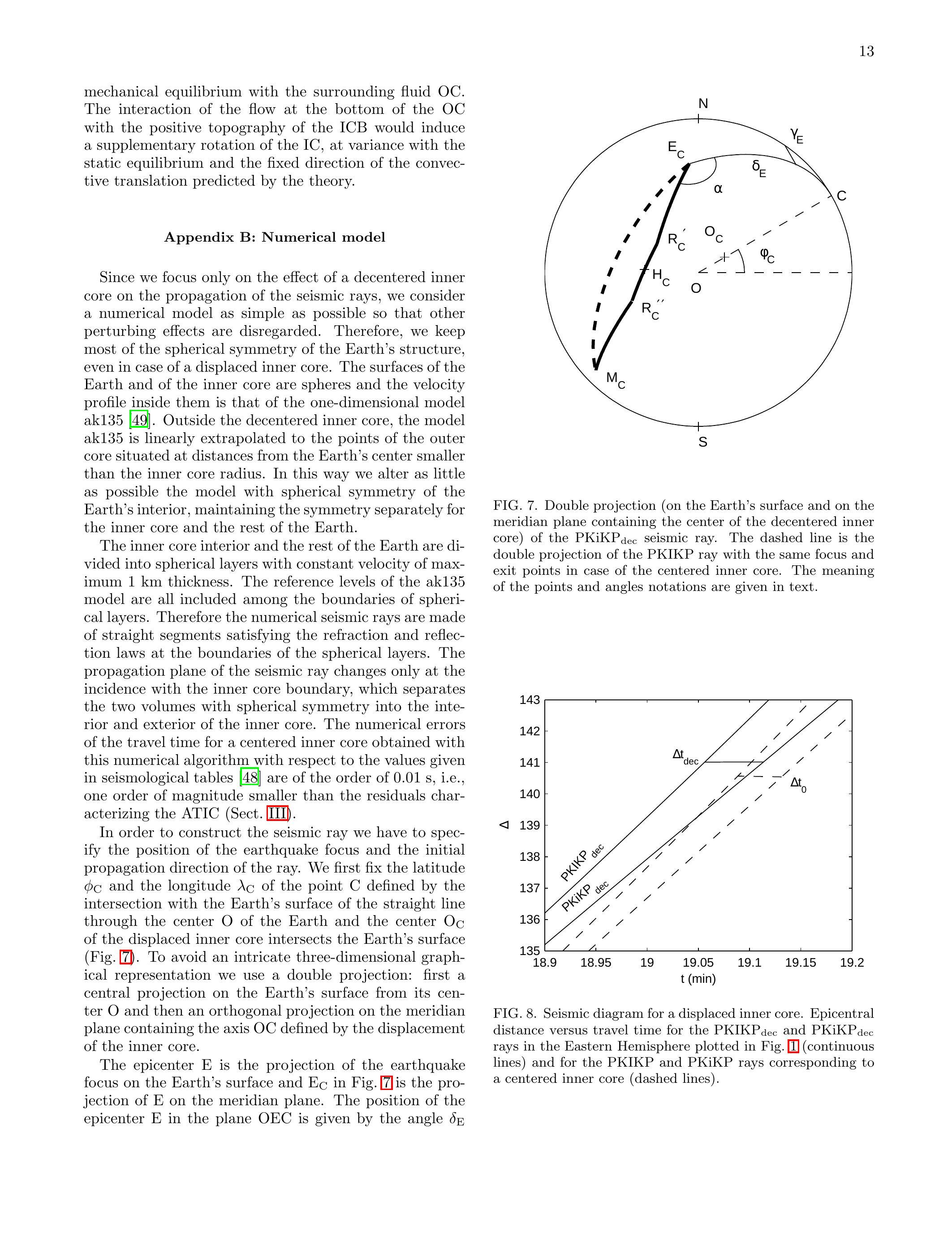 The inner core interior and the rest of the Earth are divided into spherical layers with constant velocity of maximum 1 km thickness. The reference levels of the ak135 model are all included among the boundaries of spherical layers. Therefore the numerical seismic rays are made of straight segments satisfying the refraction and reflection laws at the boundaries of the spherical layers. The propagation plane of the seismic ray changes only at the incidence with the inner core boundary, which separates the two volumes with spherical symmetry into the interior and exterior of the inner core. The numerical errors of the travel time for a centered inner core obtained with this numerical algorithm with respect to the values given in seismological tables [48] are of the order of 0.01 s , i.e., one order of magnitude smaller than the residuals characterizing the ATIC (Sect. III).