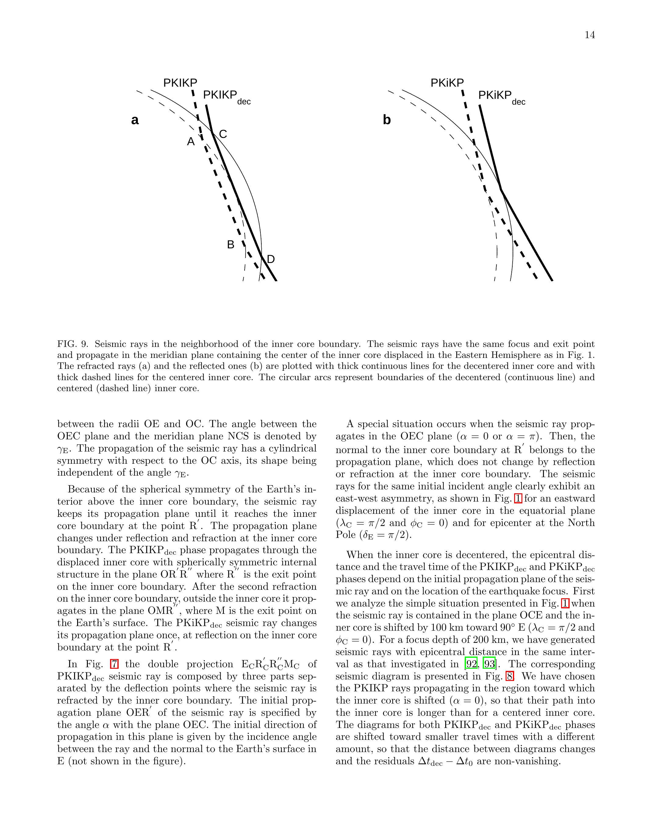 There is another geometric effect which modifies the differential travel time Deltat_(dec)\Delta t_{\mathrm{dec}}. The segment CD of the seismic ray within the decentered inner core is longer than the segment AB for the centered inner core (Fig. 9a). Because the velocity in the inner core is larger than in the outer core, the travel time of the PKIKP _("dec "){ }_{\text {dec }} phase has an additional decrease, the differential travel time Deltat_(dec)\Delta t_{\mathrm{dec}} increases, and the residual Deltat_(dec)-Deltat_(0)\Delta t_{\mathrm{dec}}-\Delta t_{0} becomes positive. In the diametrically opposite region of the inner