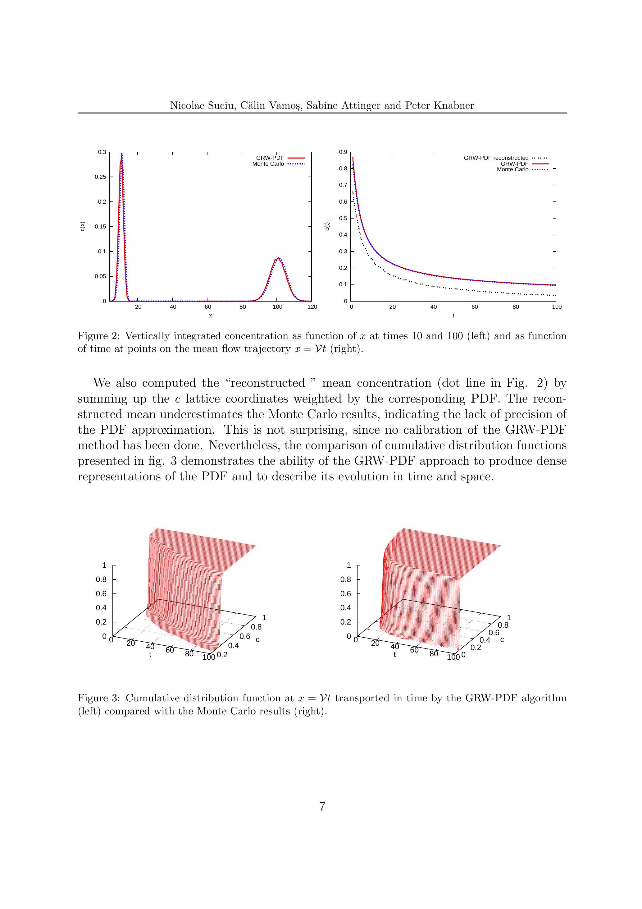We also computed the "reconstructed" mean concentration (dot line in Fig. 2) by summing up the c c ccc lattice coordinates weighted by the corresponding PDF. The reconstructed mean underestimates the Monte Carlo results, indicating the lack of precision of the PDF approximation. This is not surprising, since no calibration of the GRW-PDF method has been done. Nevertheless, the comparison of cumulative distribution functions presented in fig. 3 demonstrates the ability of the GRW-PDF approach to produce dense representations of the PDF and to describe its evolution in time and space.