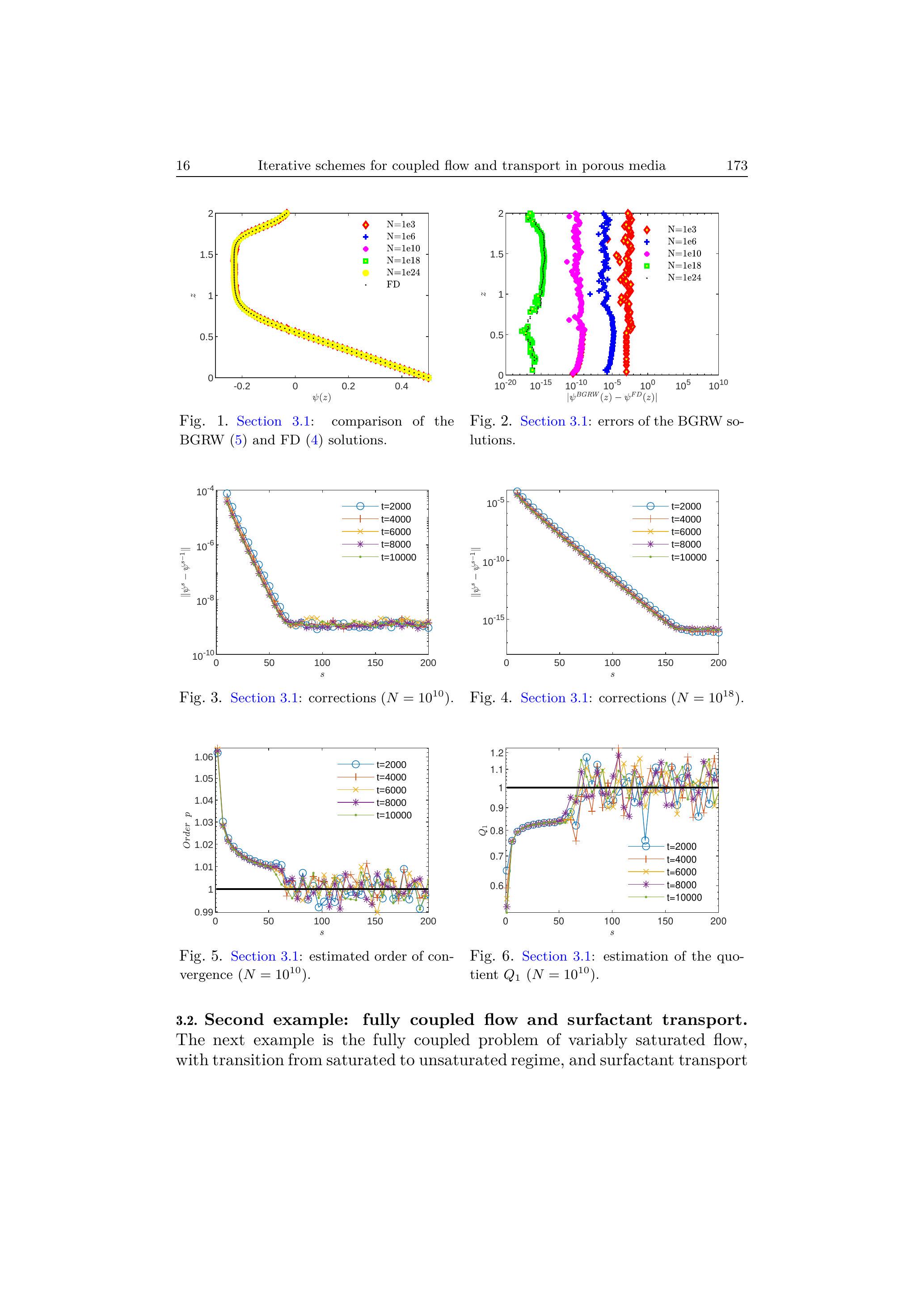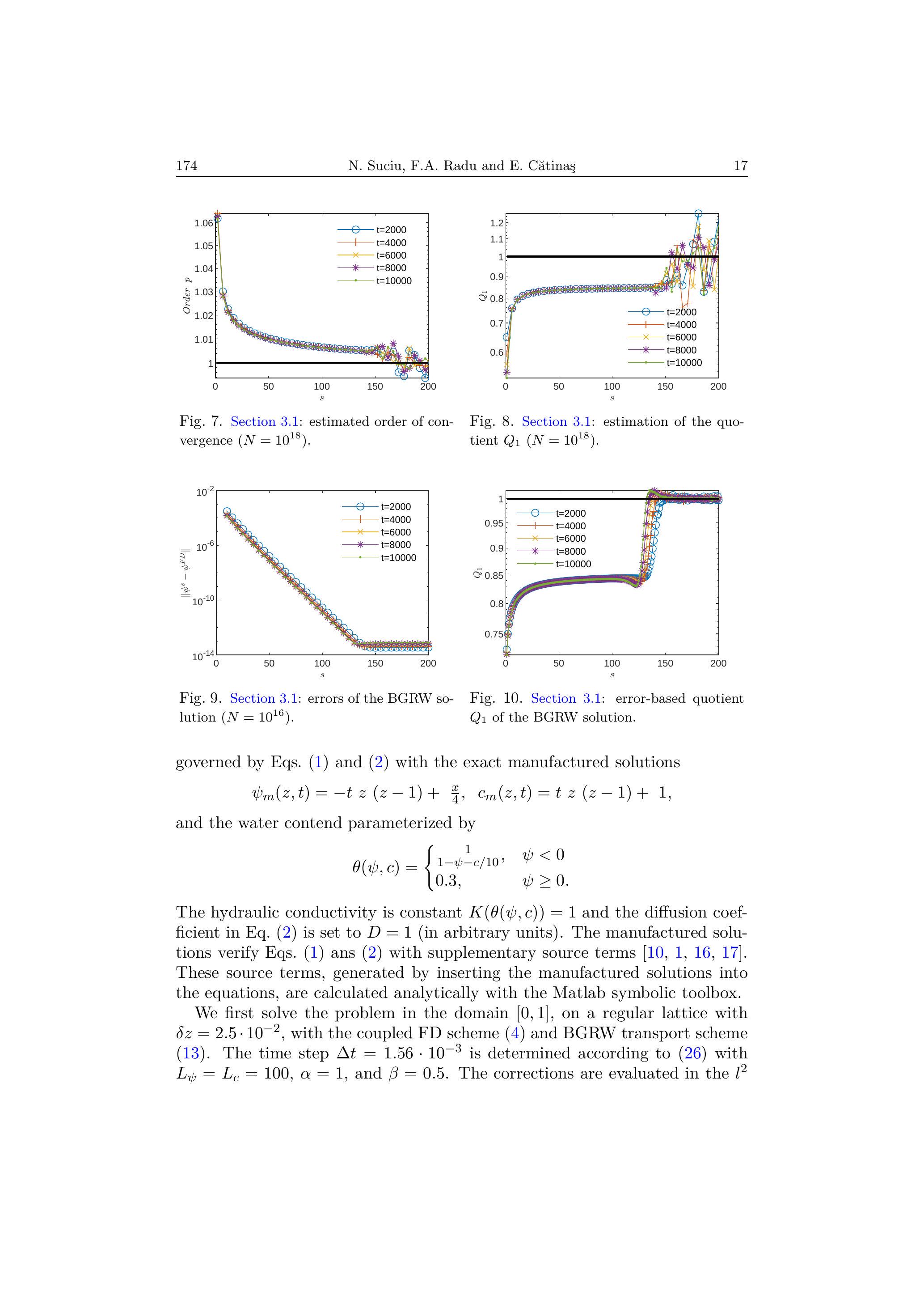 The convergence of the iterative schemes has been investigated through estimations of computational and error-based orders of convergence. The three examples presented in Section 3 provide numerical arguments for the C^(')C^{\prime}-linear convergence. According to Remark 5, the C^(')C^{\prime}-linear convergence indicates the uniqueness of the iterative solutions and their convergence to the solutions of the nonlinear schemes. The sequences of errors with respect to exact manufactured solutions of the coupled problem presented in Section 3.2 and Section 3.3 are only sublinearly CC convergent and illustrate the impossibility of achieving the CC-liner convergence via numerical simulations, pointed out in Remark 6. However, with the FD solution as reference, we have shown that the random walk BGRW LL-scheme for Richards' equation could be CC-linear convergent (Fig. 9). Using grid convergence tests and manufactured solutions