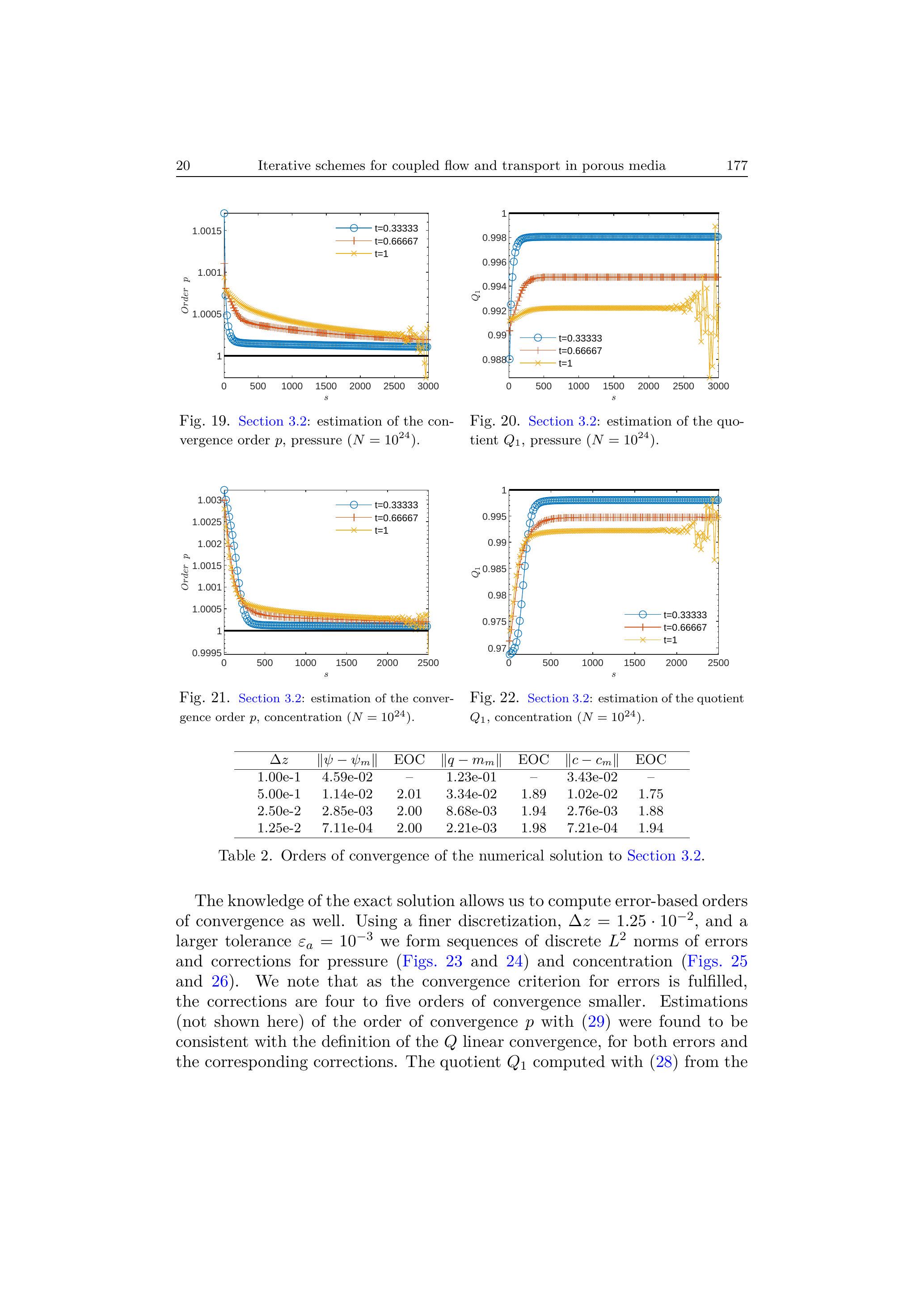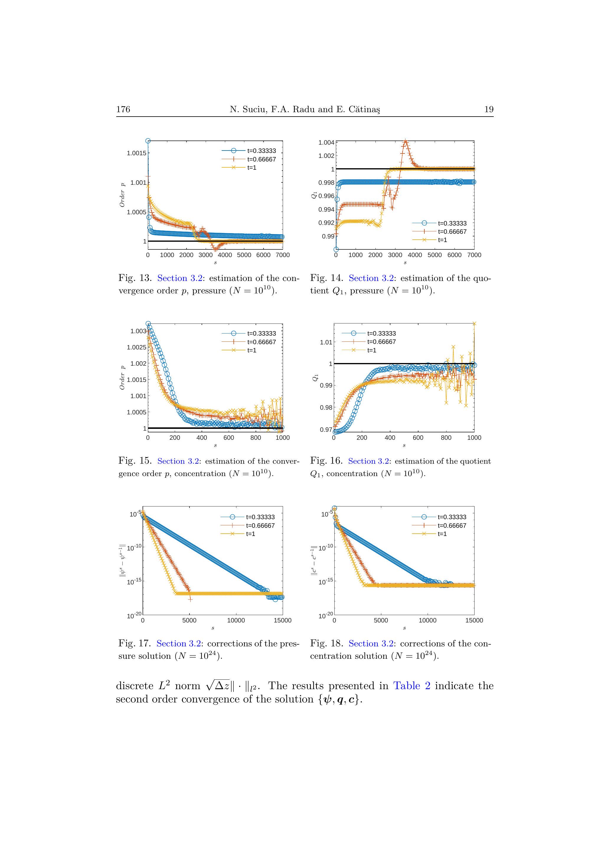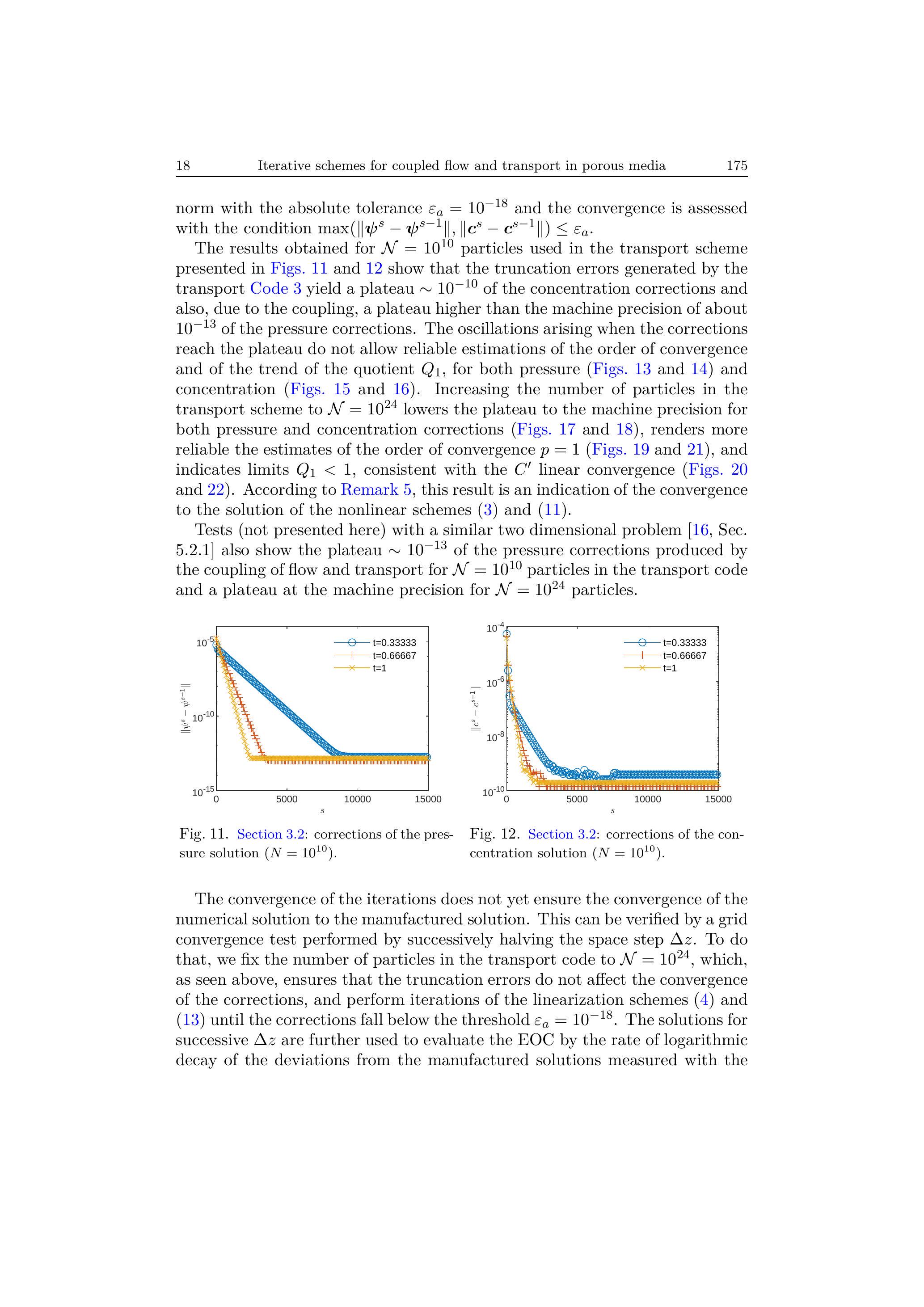 The results obtained for N=10^(10)\mathcal{N}=10^{10} particles used in the transport scheme presented in Figs. 11 and 12 show that the truncation errors generated by the transport Code 3 yield a plateau ∼10^(-10)\sim 10^{-10} of the concentration corrections and also, due to the coupling, a plateau higher than the machine precision of about 10^(-13)10^{-13} of the pressure corrections. The oscillations arising when the corrections reach the plateau do not allow reliable estimations of the order of convergence and of the trend of the quotient Q_(1)Q_{1}, for both pressure (Figs. 13 and 14) and concentration (Figs. 15 and 16). Increasing the number of particles in the transport scheme to N=10^(24)\mathcal{N}=10^{24} lowers the plateau to the machine precision for both pressure and concentration corrections (Figs. 17 and 18), renders more reliable the estimates of the order of convergence p=1p=1 (Figs. 19 and 21), and indicates limits Q_(1) < 1Q_{1}<1, consistent with the C^(')C^{\prime} linear convergence (Figs. 20 and 22). According to Remark 5, this result is an indication of the convergence to the solution of the nonlinear schemes (3) and (11).