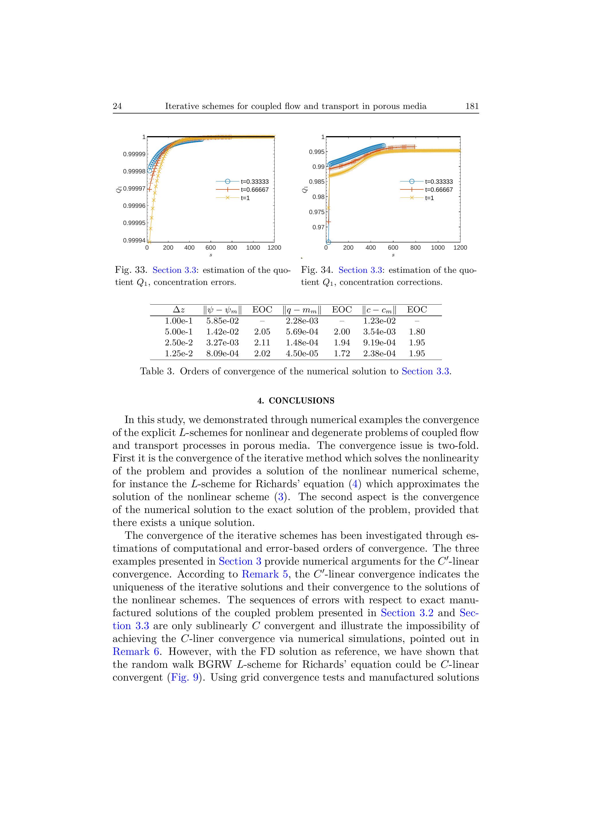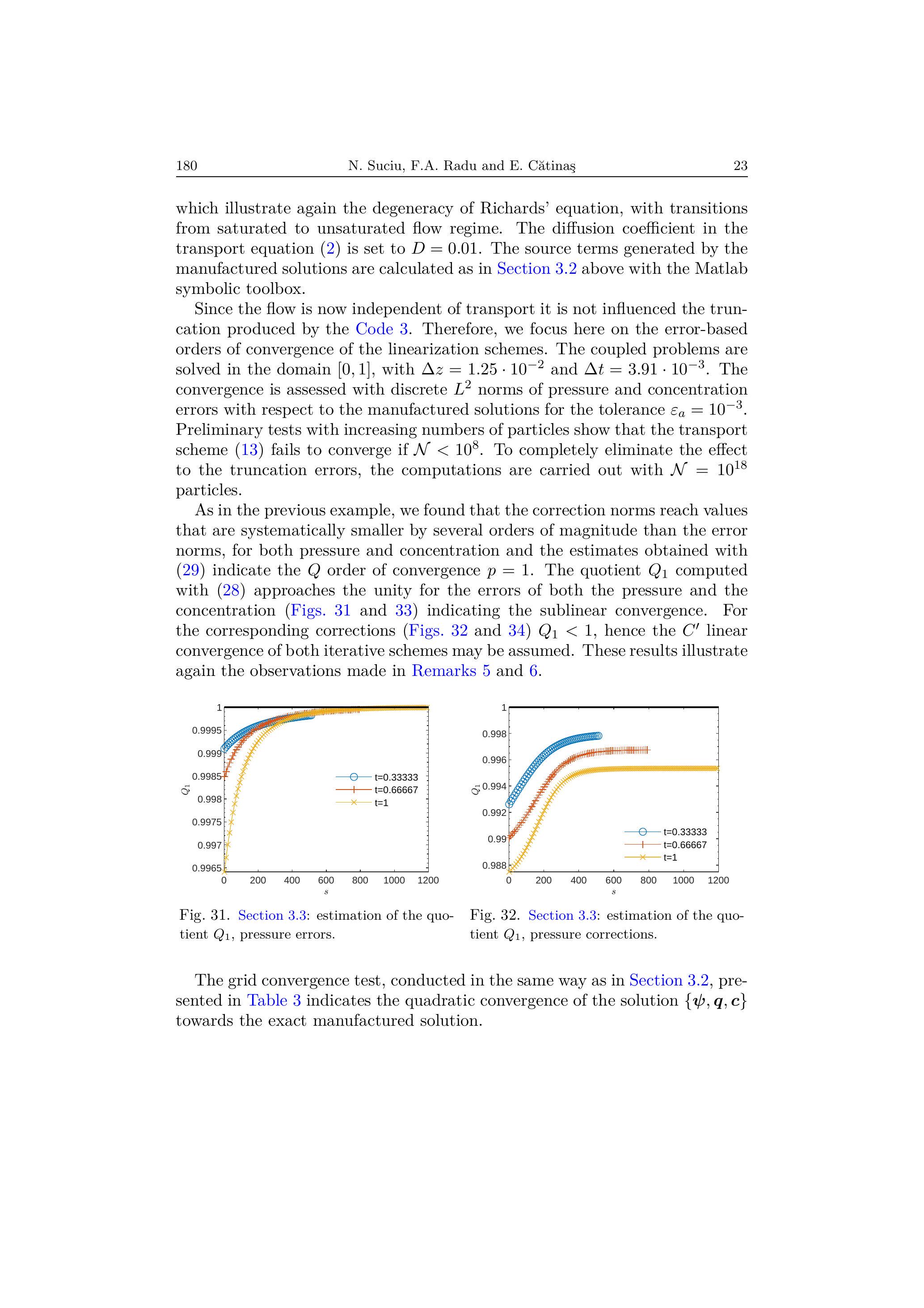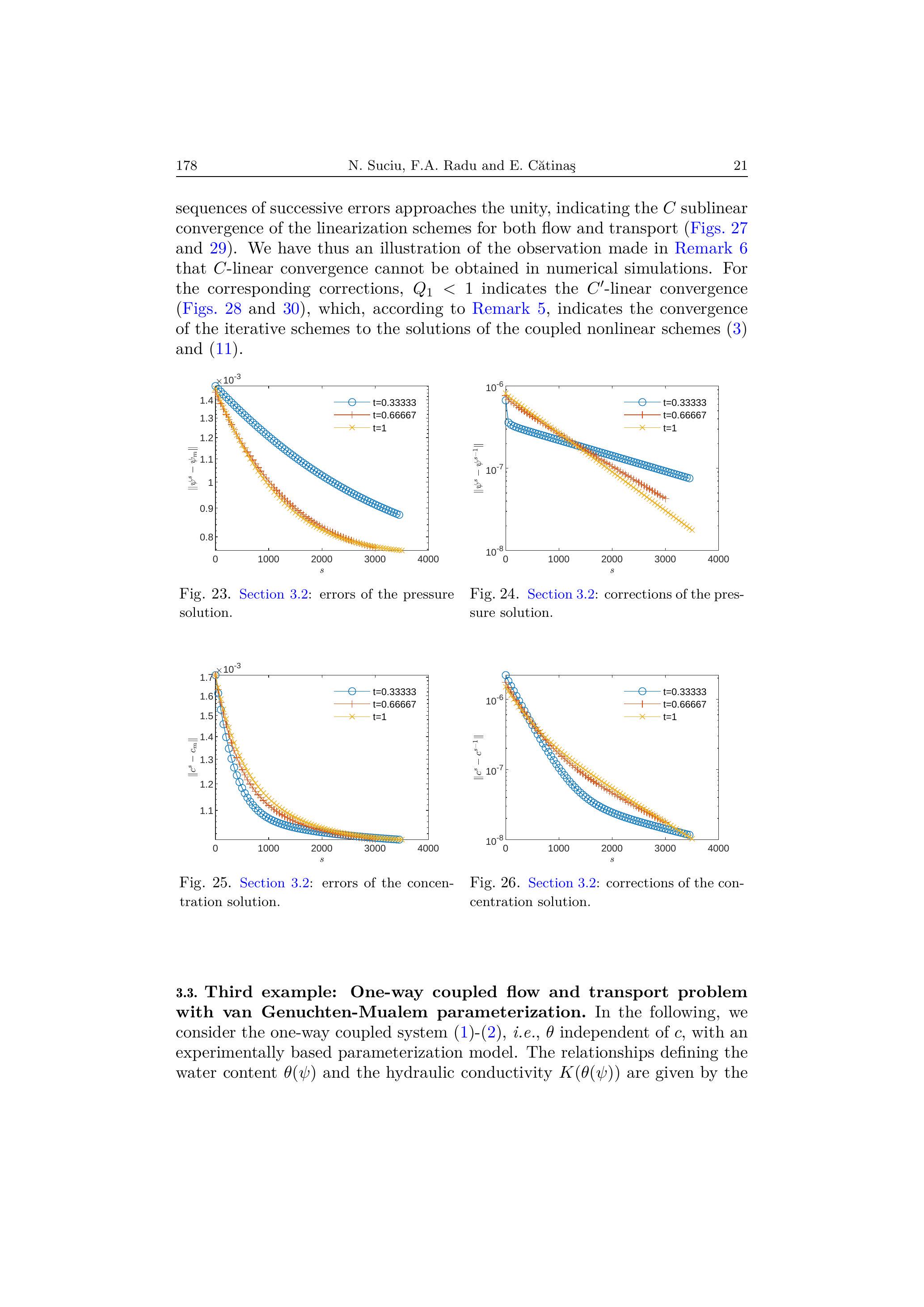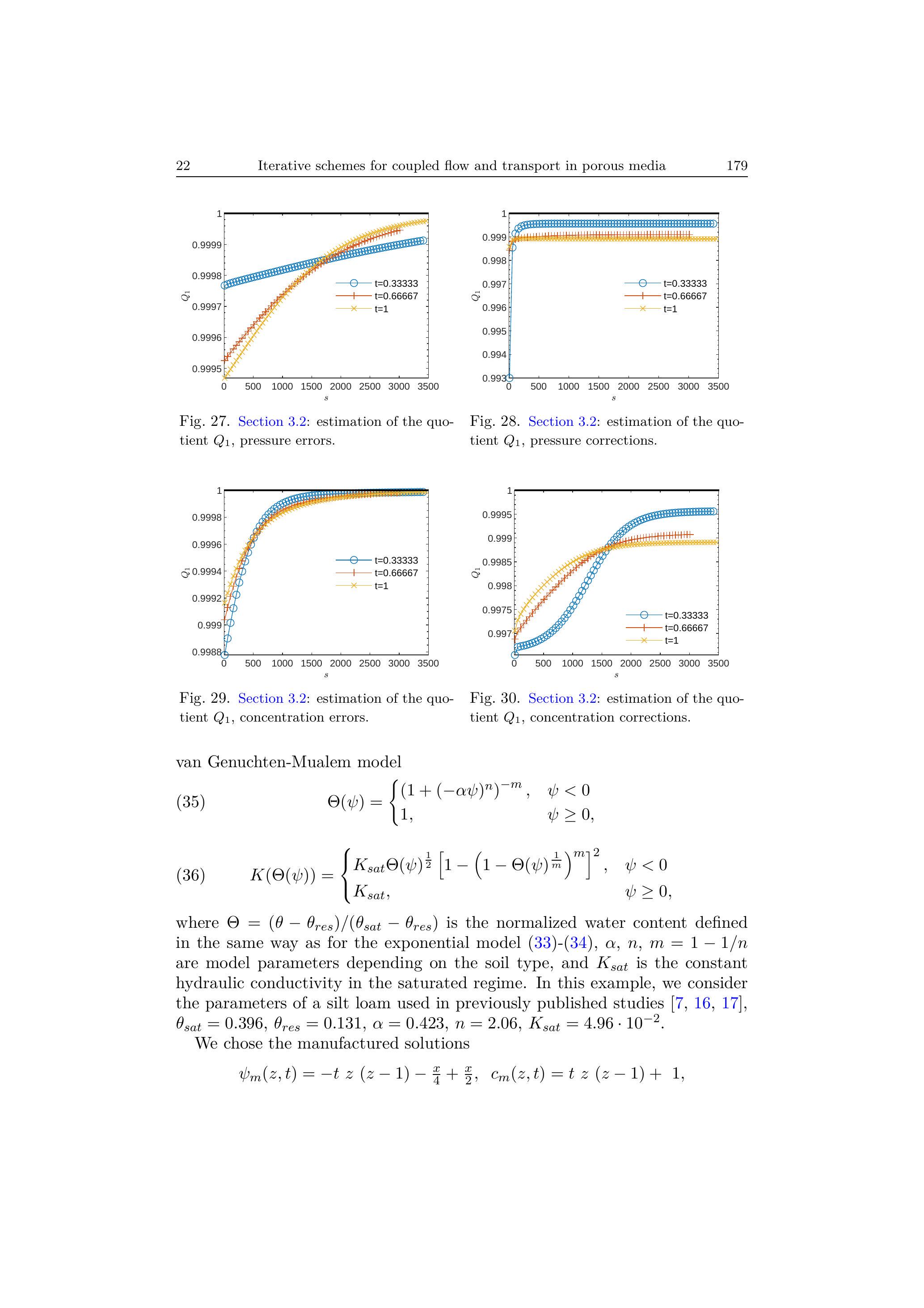 sequences of successive errors approaches the unity, indicating the CC sublinear convergence of the linearization schemes for both flow and transport (Figs. 27 and 29 ). We have thus an illustration of the observation made in Remark 6 that CC-linear convergence cannot be obtained in numerical simulations. For the corresponding corrections, Q_(1) < 1Q_{1}<1 indicates the C^(')C^{\prime}-linear convergence (Figs. 28 and 30), which, according to Remark 5, indicates the convergence of the iterative schemes to the solutions of the coupled nonlinear schemes (3) and (11).