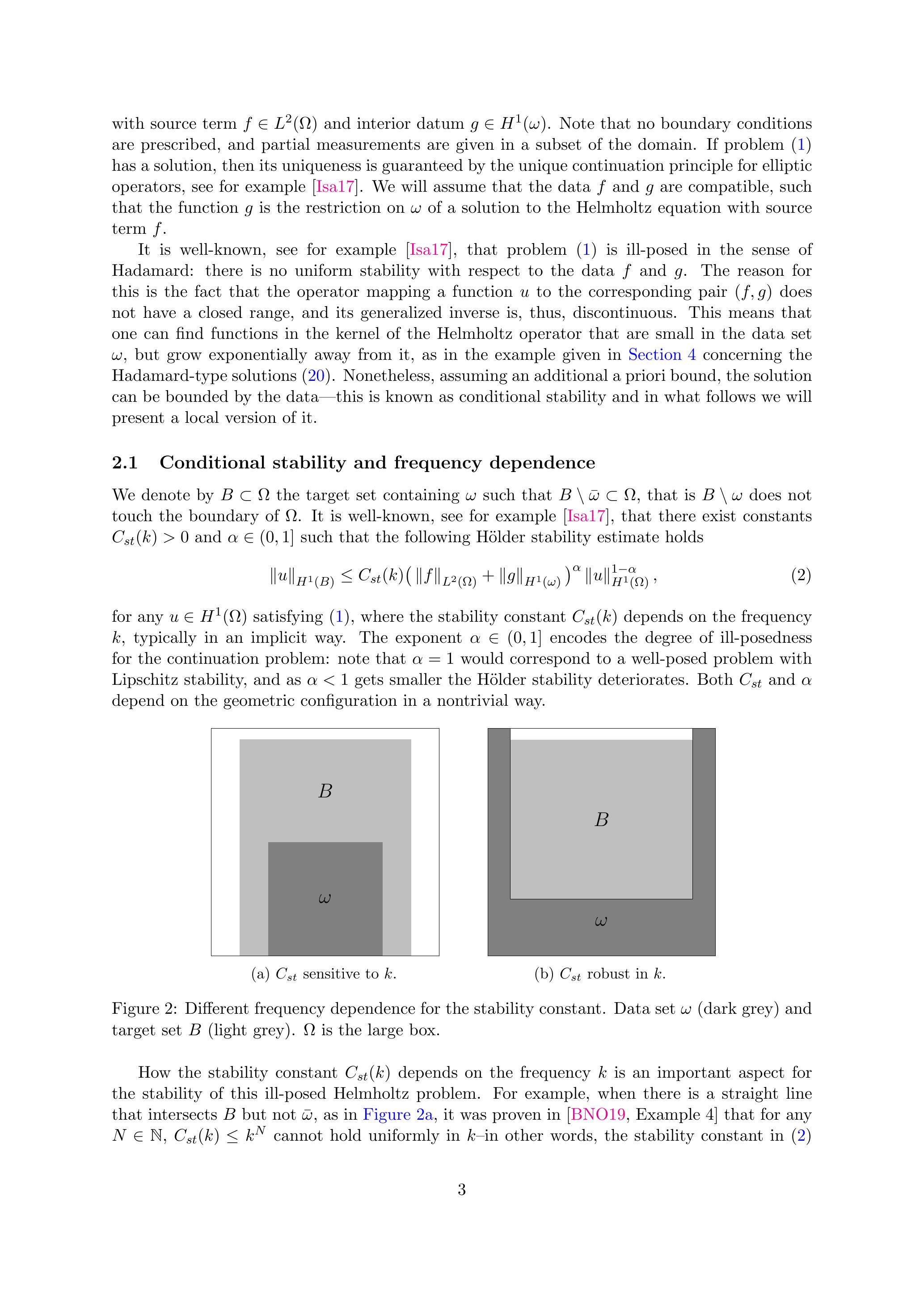We denote by B sub OmegaB \subset \Omega the target set containing omega\omega such that B\\ bar(omega)sub OmegaB \backslash \bar{\omega} \subset \Omega, that is B\\omegaB \backslash \omega does not touch the boundary of Omega\Omega. It is well-known, see for example [Isa17], that there exist constants C_(st)(k) > 0C_{s t}(k)>0 and alpha in(0,1]\alpha \in(0,1] such that the following Hölder stability estimate holds