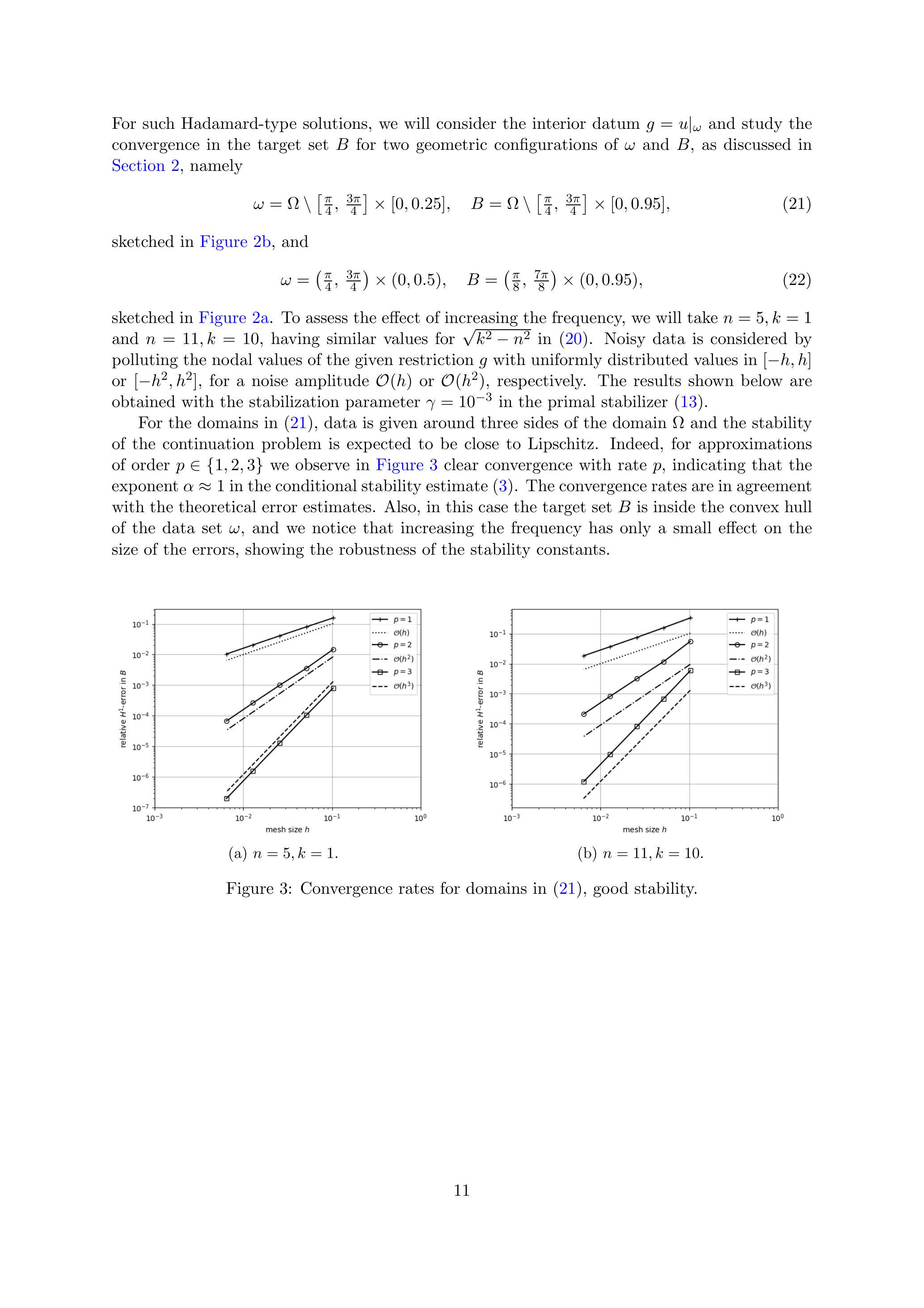 For the domains in (21), data is given around three sides of the domain Omega\Omega and the stability of the continuation problem is expected to be close to Lipschitz. Indeed, for approximations of order p in{1,2,3}p \in\{1,2,3\} we observe in Figure 3 clear convergence with rate pp, indicating that the exponent alpha~~1\alpha \approx 1 in the conditional stability estimate (3). The convergence rates are in agreement with the theoretical error estimates. Also, in this case the target set BB is inside the convex hull of the data set omega\omega, and we notice that increasing the frequency has only a small effect on the size of the errors, showing the robustness of the stability constants.