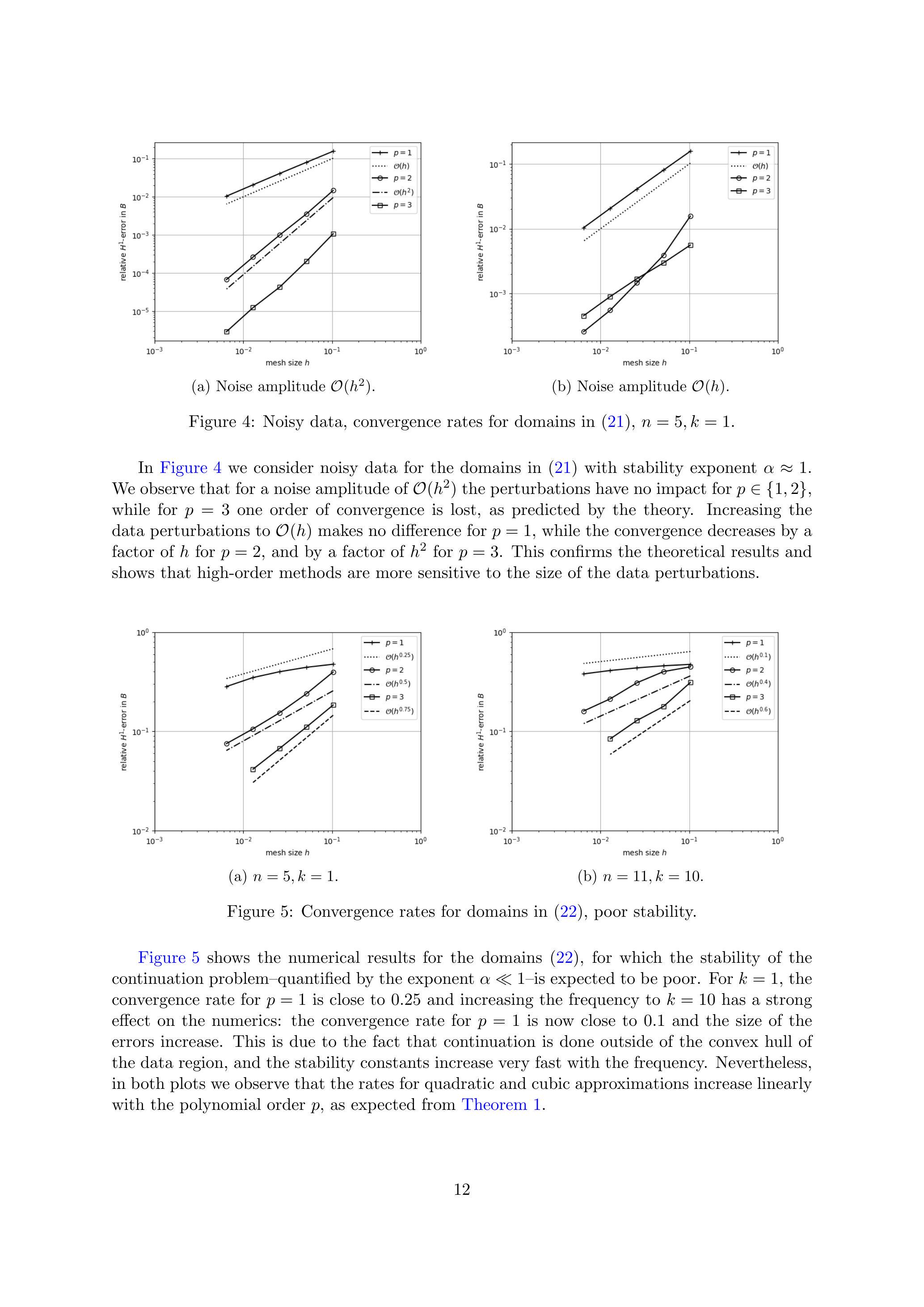 In Figure 4 we consider noisy data for the domains in (21) with stability exponent alpha~~1\alpha \approx 1. We observe that for a noise amplitude of O(h^(2))\mathcal{O}\left(h^{2}\right) the perturbations have no impact for p in{1,2}p \in\{1,2\}, while for p=3p=3 one order of convergence is lost, as predicted by the theory. Increasing the data perturbations to O(h)\mathcal{O}(h) makes no difference for p=1p=1, while the convergence decreases by a factor of hh for p=2p=2, and by a factor of h^(2)h^{2} for p=3p=3. This confirms the theoretical results and shows that high-order methods are more sensitive to the size of the data perturbations.