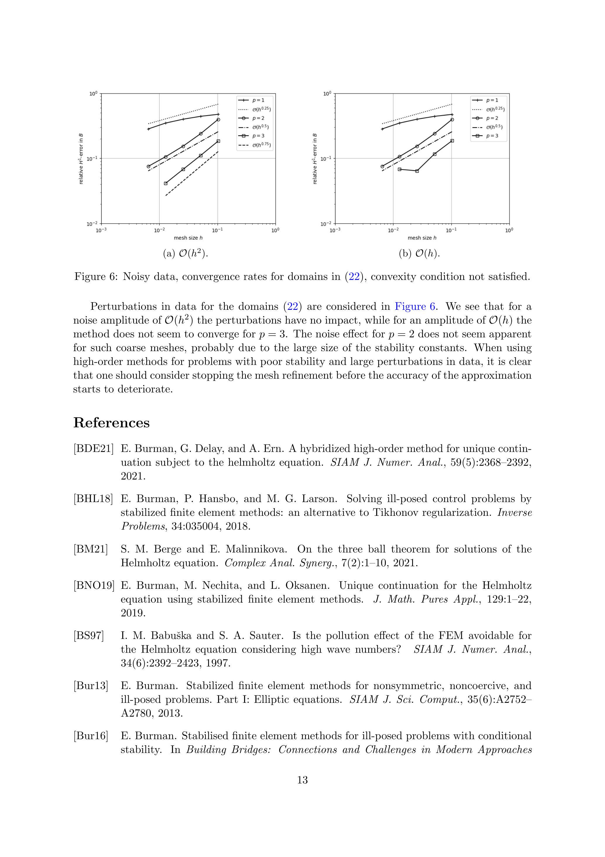 Perturbations in data for the domains (22) are considered in Figure 6. We see that for a noise amplitude of O(h^(2))\mathcal{O}\left(h^{2}\right) the perturbations have no impact, while for an amplitude of O(h)\mathcal{O}(h) the method does not seem to converge for p=3p=3. The noise effect for p=2p=2 does not seem apparent for such coarse meshes, probably due to the large size of the stability constants. When using high-order methods for problems with poor stability and large perturbations in data, it is clear that one should consider stopping the mesh refinement before the accuracy of the approximation starts to deteriorate.