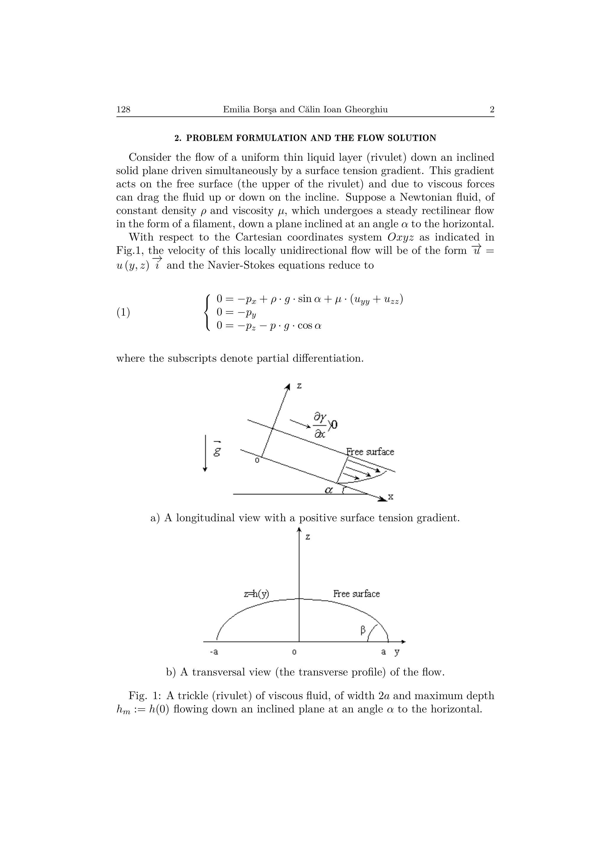 We consider beta\beta to be a prescribed constant such that beta < pi//2\beta<\pi / 2. A constant value of beta\beta means that any contact angle "hysteresis" is ignored. We appreciate this hypothesis as reasonable for these rivulets. On the physical nature of the shear stress tau\tau we have to make the following important remark. The origin of tau\tau could be very diverse. We are mainly interested when this stress comes from a local variation of surface tension, such that tau=(del gamma)/(del x)\tau=\frac{\partial \gamma}{\partial x}. Actually, gamma\gamma may vary somewhat along xx-axis and then the flow will not be truly unidirectional. However, the above approach may still be approximately correct if gamma\gamma varies only slowly. A more sophisticated model that takes into account reactions, fluxes of surfactants on the free surface, surface diffusion and convection, change of metrics, etc., is available for example in [14]. To consider such models is beyond our computational capabilities. Consequently, we simply solve the differential system (2)-(5), using the strategy from Wilson and Duffy [15] and finally plug in (del gamma)/(del x)\frac{\partial \gamma}{\partial x} for the shear stress tau\tau.