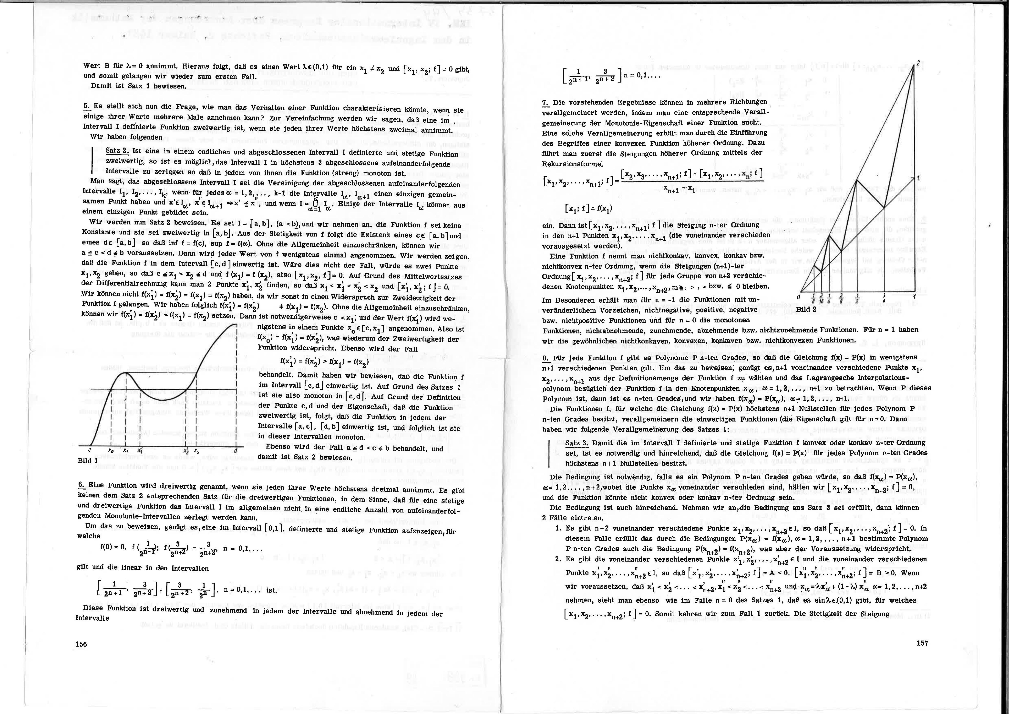 , It isI=[a,b]I=[a, b], ( a < ba<b), and we assume the functionffis not a constant and it is two-valued in[a,b][a, b]. From the continuity offffollows the existence of ac in[a,b]c \in[a, b]and oned epsilon[a,b]d \epsilon[a, b]so that inff=f(c)f=f(c), sup f=f(alpha)f=f(\alpha). Without loss of generality, we can say that d [c,d] is single-valued. If this were not the case, there would be two pointsx_(1),x_(2)x_{1}, x_{2}so thatc <= x_(1) < x_(2) <= dc \leq x_{1}<x_{2} \leq dandf(x_(1))=f(x_(2))f\left(x_{1}\right)=f\left(x_{2}\right), also [x_(1),x_(2),f]=0\left[x_{1}, x_{2}, f\right]=0. Based on the mean value theorem Wörx_(1),x_(2)^(')x_{1}, x_{2}^{\prime}find so thatx_(1) < x_(1) < x_(2)^(') < x_(2)x_{1}<x_{1}<x_{2}^{\prime}<x_{2}and[x_(1)^('),x_(2)^(')]\left[x_{1}^{\prime}, x_{2}^{\prime}\right]. can wef(x_(1)^('))=f(x_(2)^(')) < f(x_(1))quad,f(x_(1))=f(x_(2))f\left(x_{1}^{\prime}\right)=f\left(x_{2}^{\prime}\right)<f\left(x_{1}\right) \quad, f\left(x_{1}\right)=f\left(x_{2}\right). Without limiting the generality,f(x_(1))=f(x_(2)) < f(x_(1))=f(x_(2))\mathrm{f}\left(\mathrm{x}_{1}\right)=\mathrm{f}\left(\mathrm{x}_{2}\right)<\mathrm{f}\left(\mathrm{x}_{1}\right)=\mathrm{f}\left(\mathrm{x}_{2}\right). f(x),y,x,y\mathrm{f}(\mathrm{x}), \mathrm{y}, \mathrm{x}, \mathrm{y}assumed. Sof(x_(0))=f(x_(1))=f(x_(2))f\left(x_{0}\right)=f\left(x_{1}\right)=f\left(x_{2}\right), which contradicts the bivalence of the function. Likewise, the case