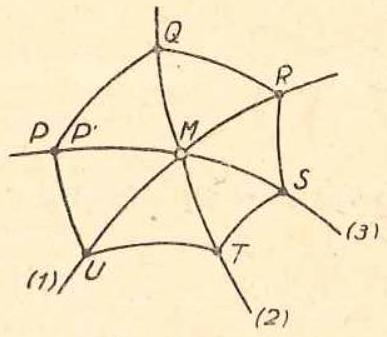 If is a point on the surface through which a curve from each family passes (fig. 1), then we take a point on a curve in the family (3). We carry through the corresponding curve in family (1) that cuts in the given curve from family (2). By we take the corresponding curve from family (3), which intersects the curve given from (1) in and we continue this construction until we reach the initial curve again at the point If the points and coincide, then the hexagon is closed and the weave is called hexagonal. This property is easily verified for the weave formed by three parallel line bundles.