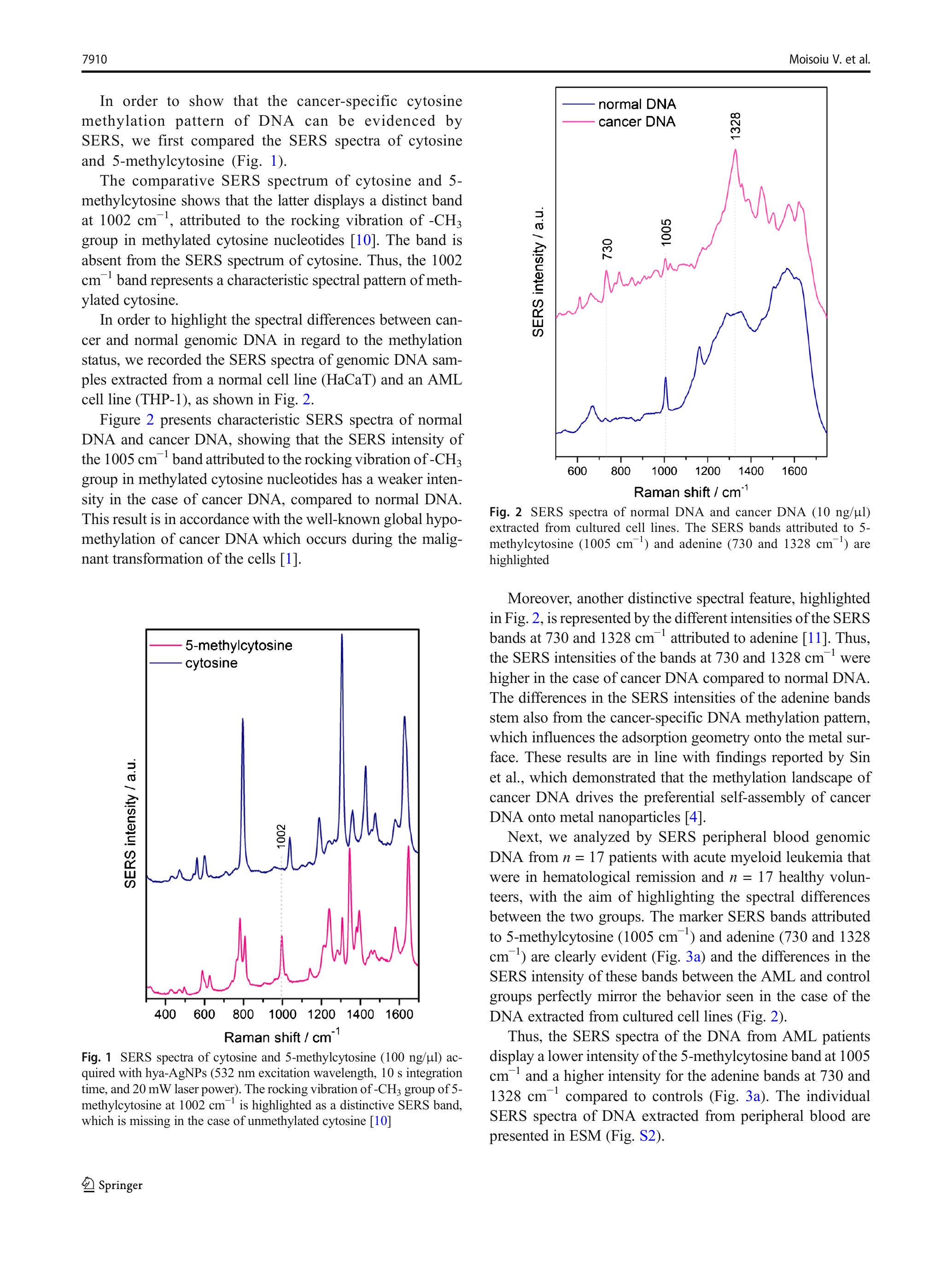 Moreover, another distinctive spectral feature, highlighted in Fig. 2, is represented by the different intensities of the SERS bands at 730 and 1328cm^(-1)1328 \mathrm{~cm}^{-1} attributed to adenine [11]. Thus, the SERS intensities of the bands at 730 and 1328cm^(-1)1328 \mathrm{~cm}^{-1} were higher in the case of cancer DNA compared to normal DNA. The differences in the SERS intensities of the adenine bands stem also from the cancer-specific DNA methylation pattern, which influences the adsorption geometry onto the metal surface. These results are in line with findings reported by Sin et al., which demonstrated that the methylation landscape of cancer DNA drives the preferential self-assembly of cancer DNA onto metal nanoparticles [4].