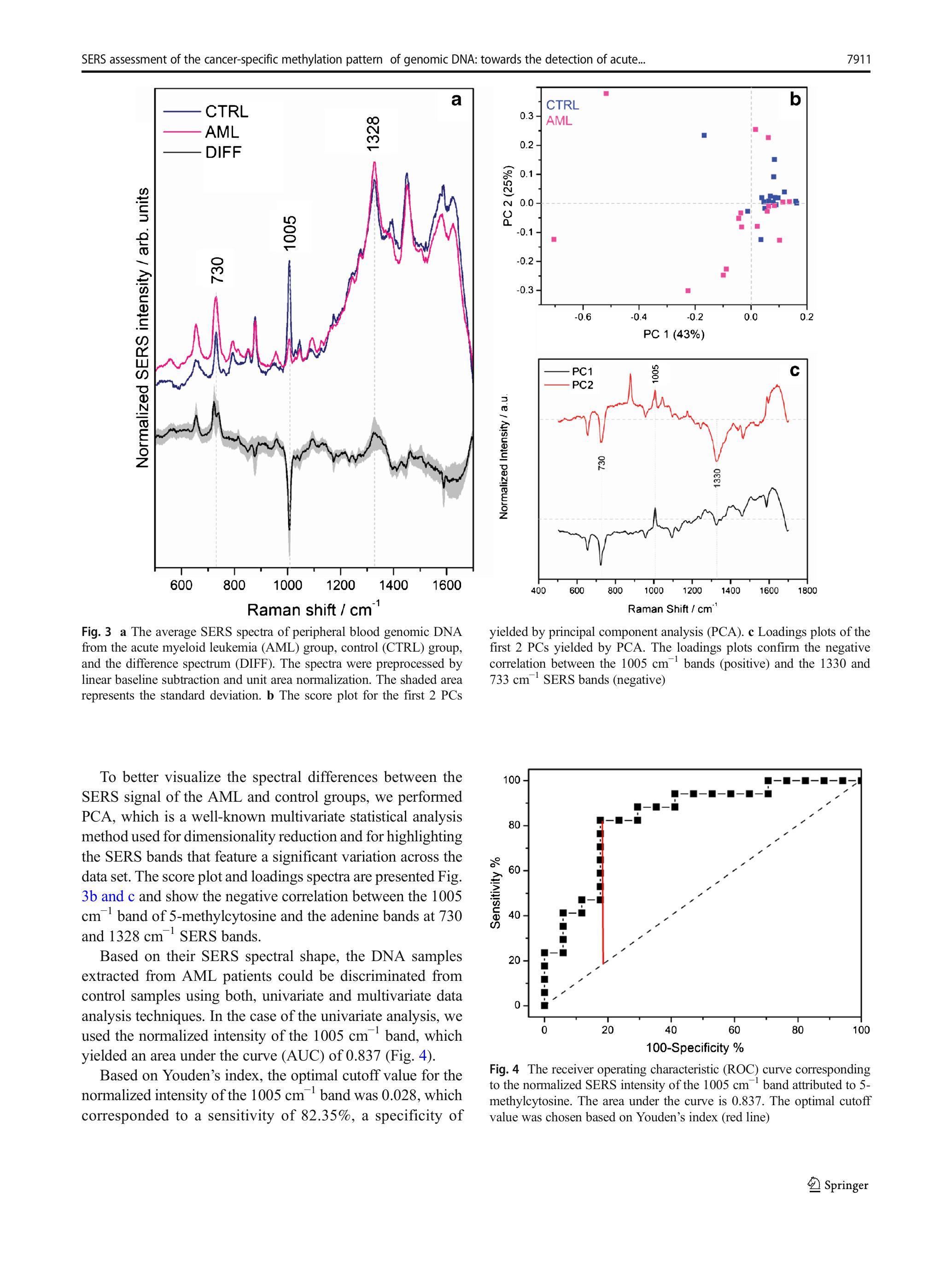 Based on their SERS spectral shape, the DNA samples extracted from AML patients could be discriminated from control samples using both, univariate and multivariate data analysis techniques. In the case of the univariate analysis, we used the normalized intensity of the 1005cm^(-1)1005 \mathrm{~cm}^{-1} band, which yielded an area under the curve (AUC) of 0.837 (Fig. 4).