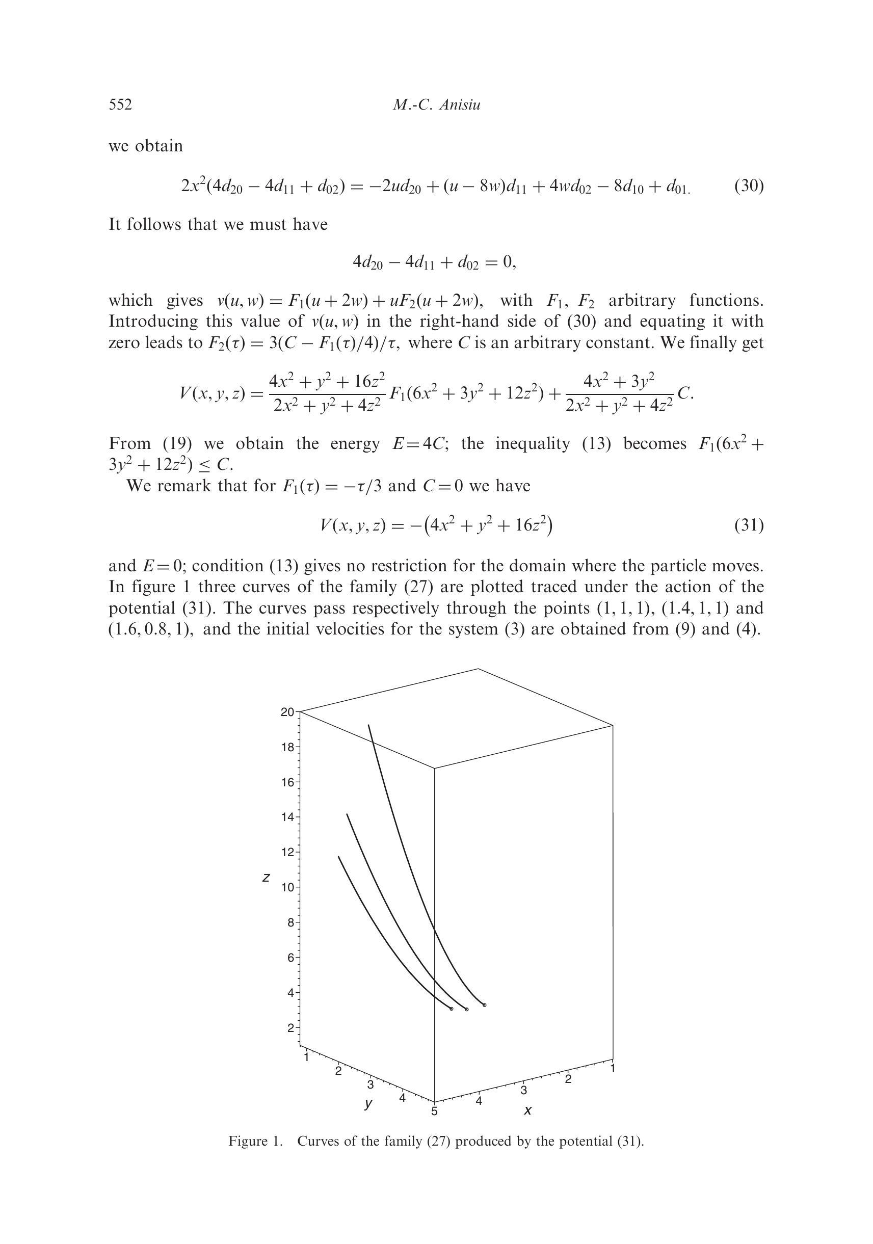 and E=0E=0; condition (13) gives no restriction for the domain where the particle moves. In figure 1 three curves of the family (27) are plotted traced under the action of the potential (31). The curves pass respectively through the points (1,1,1),(1.4,1,1)(1,1,1),(1.4,1,1) and (1.6, 0.8, 1), and the initial velocities for the system (3) are obtained from (9) and (4).