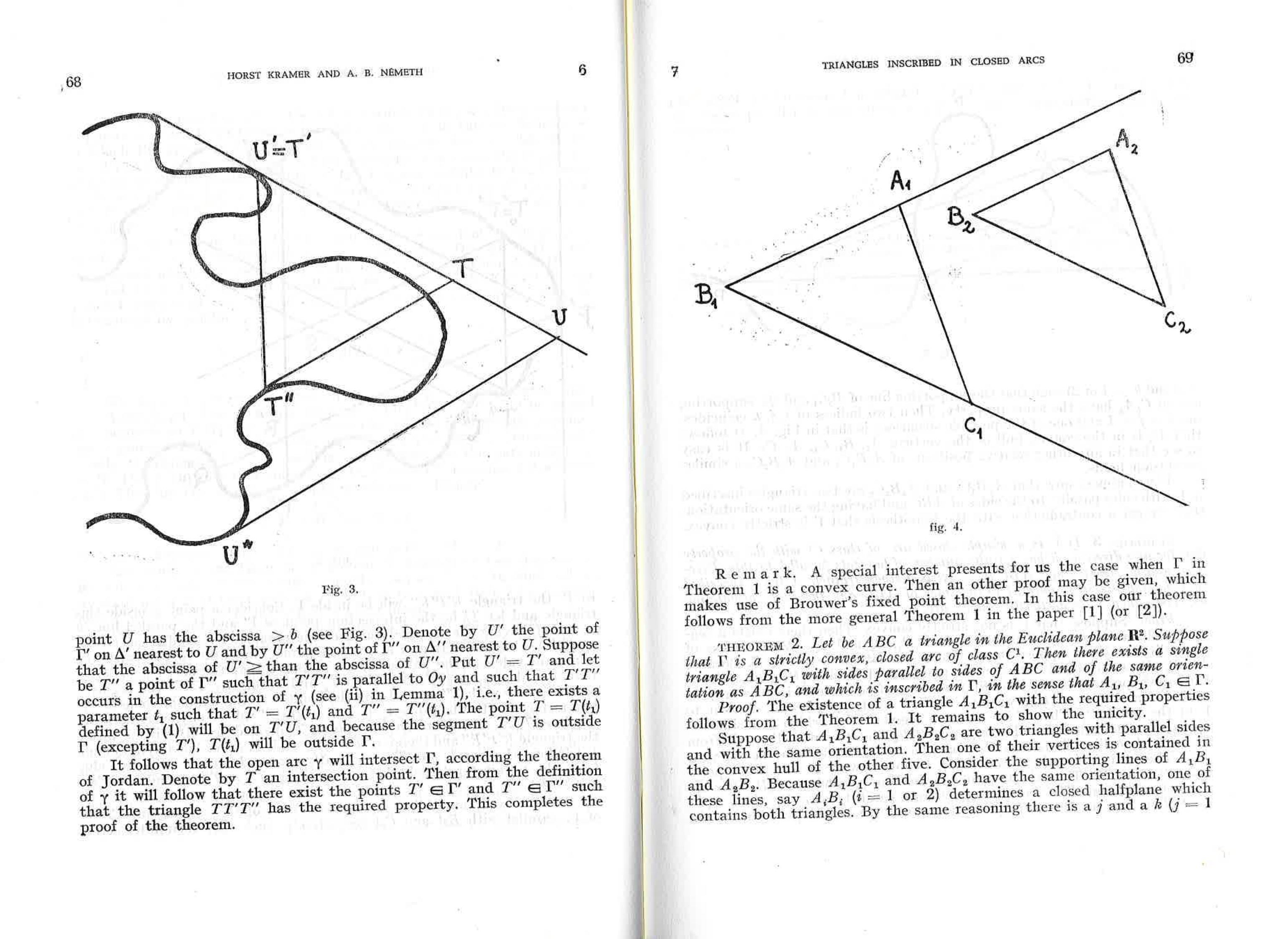 theorem 1. Let be ABC a triangle in the Euclidean plane R^(2)\mathbf{R}^{2}. Suppose that Gamma\Gamma is a simple closed arc of class C^(1)C^{1} in R^(2)\mathbf{R}^{2}, which has the property that for at least one of the sides of ABCA B C there is a finite number of points of Gamma\Gamma, in which the tangents are parallel to the respective side and in the neighbourhood of which the arc is on the same side of the tangent line. Then there exists a triangle A^(')B^(')C^(')A^{\prime} B^{\prime} C^{\prime} with sides parallel to sides of ABCA B C and of the same orientation as ABCA B C, which is inscribed in Gamma\Gamma, in the sense that A^(')A^{\prime}, B^('),C^(')in GammaB^{\prime}, C^{\prime} \in \Gamma.