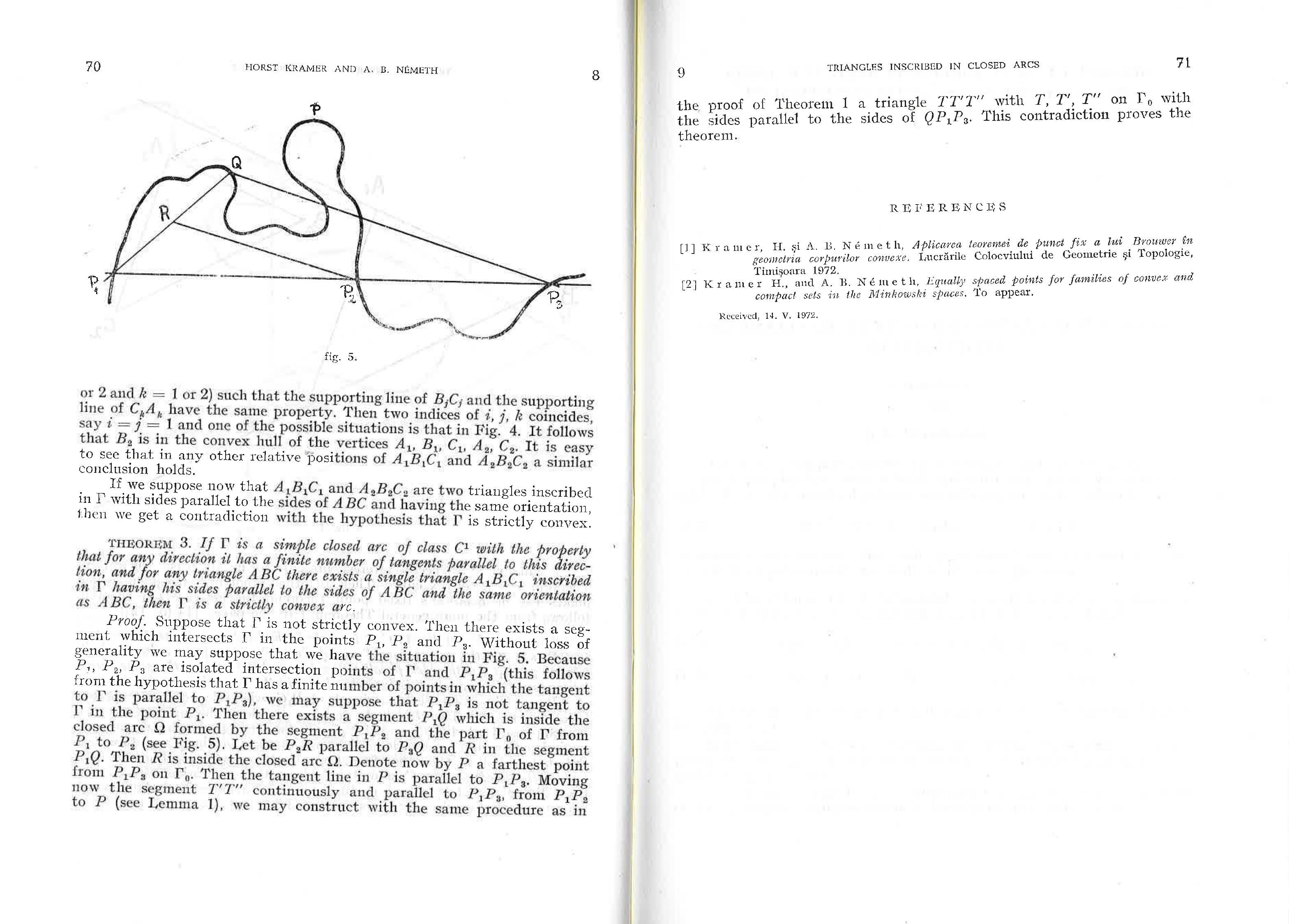 [1] Kramer, H. si A. B. Né meth, Aplicarea teovenei de punct fix a lui Brourever in geometria corpuyilor conver Lucrările Colocviului de Geometrie și Topologie, Timişoara 1972.